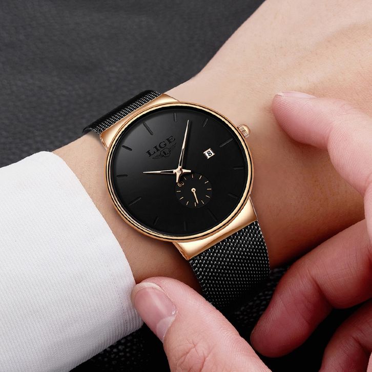 LIGE Jam Tangan Pria Hitam Sabuk Jaring Anti Air Kasual Sederhana Jam Tangan Wanita + Kotak