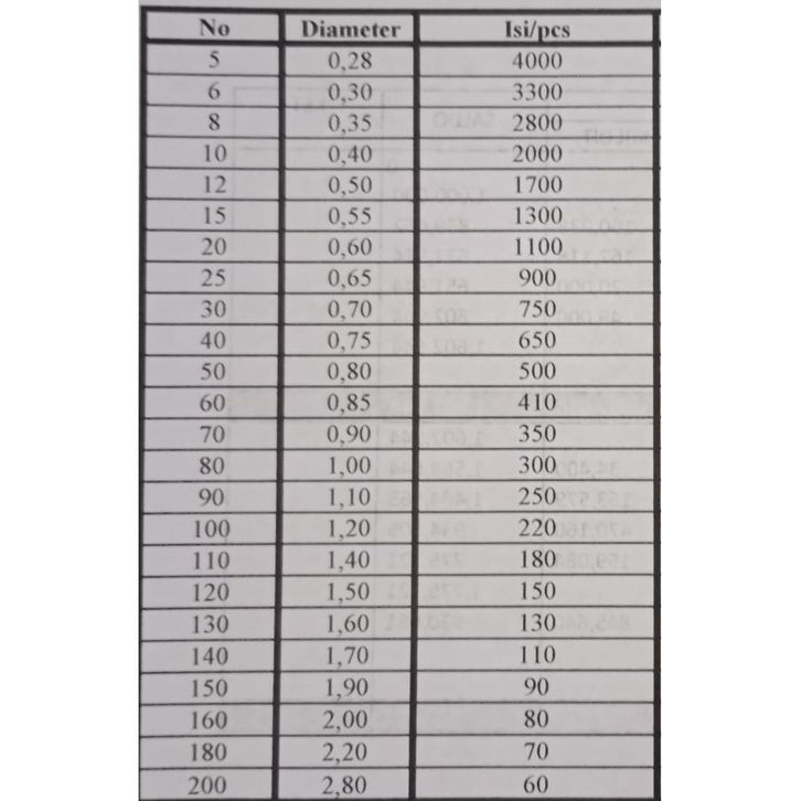 No. 3 /0.23mm, No. 4 / 0.25mm, No.1 / 0.18mm, No.10 / 0.40mm, No.100 / 1.20mm, No.110 / 1.40mm, No.12 / 0.50mm, No.120 / 1.50mm, No.130 / 1.60mm, No.140 / 1.70mm, No.15 / 0.55mm, No.150 / 1.90mm, No.160 / 2.00mm, No.2 / 0.20mm, No.20 / 0.60mm, No.200 / 2.80mm, No.25 / 0.65mm, No.30 / 0.70mm, No.40 / 0.75mm, No.5 / 0.28mm, No.50 / 0.80mm, No.6 / 0.30mm, No.60 / 0.85mm, No.70 / 0.90mm, No.8 / 0.35m, No.80 / 1.00mm, No.90 / 1.10mm