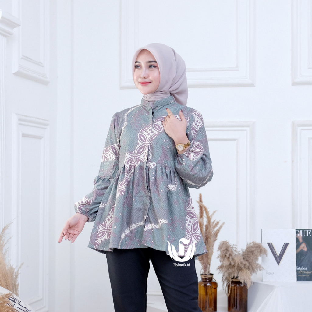 Flybatik.id Atasan Baju Batik Wanita Jumbo Modern Blouse Kerja Lengan Balon M L XL XXL