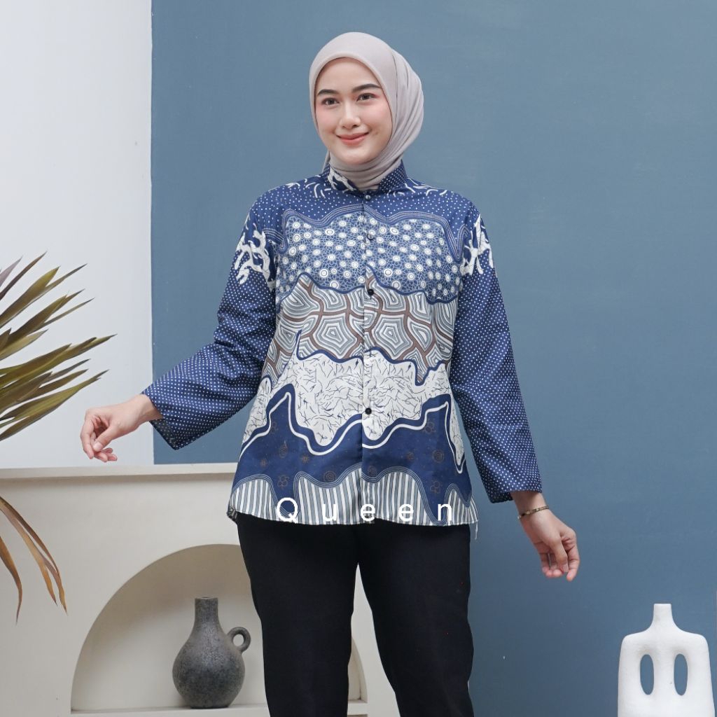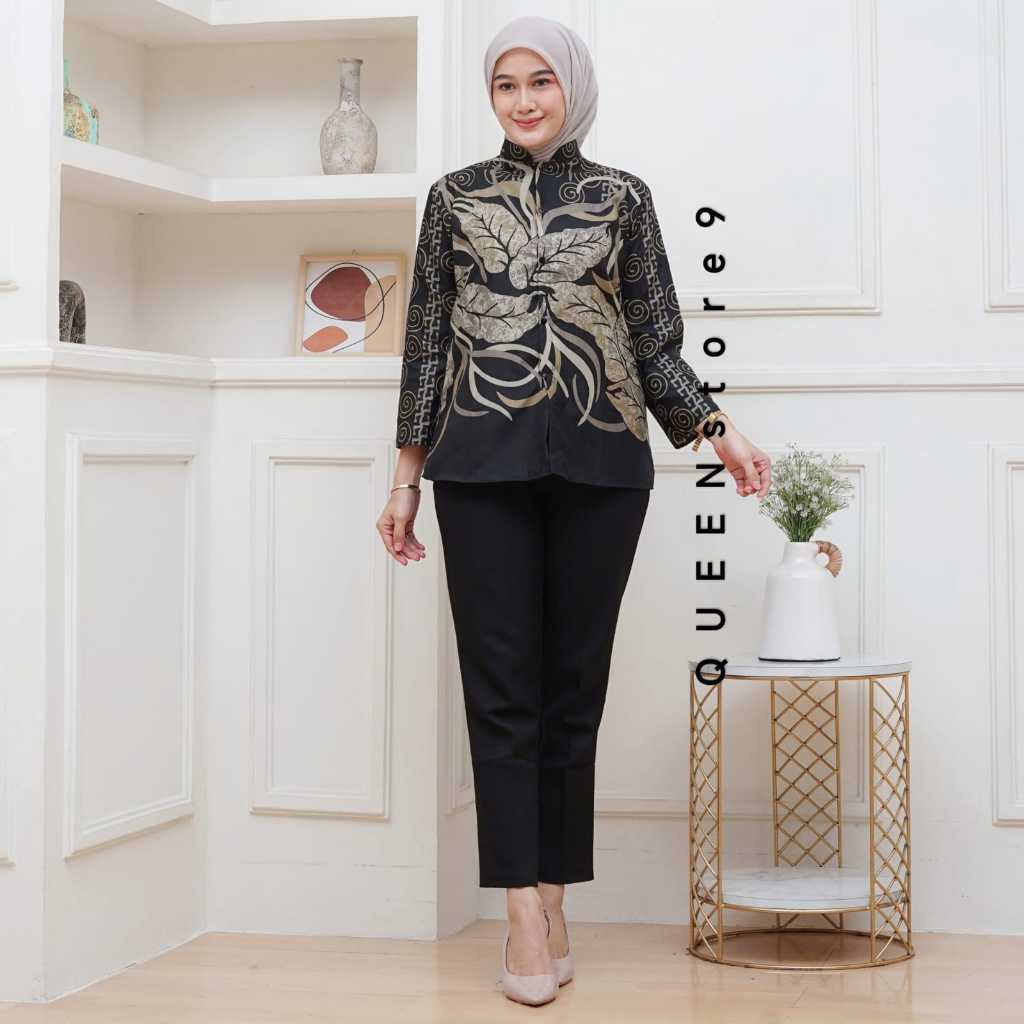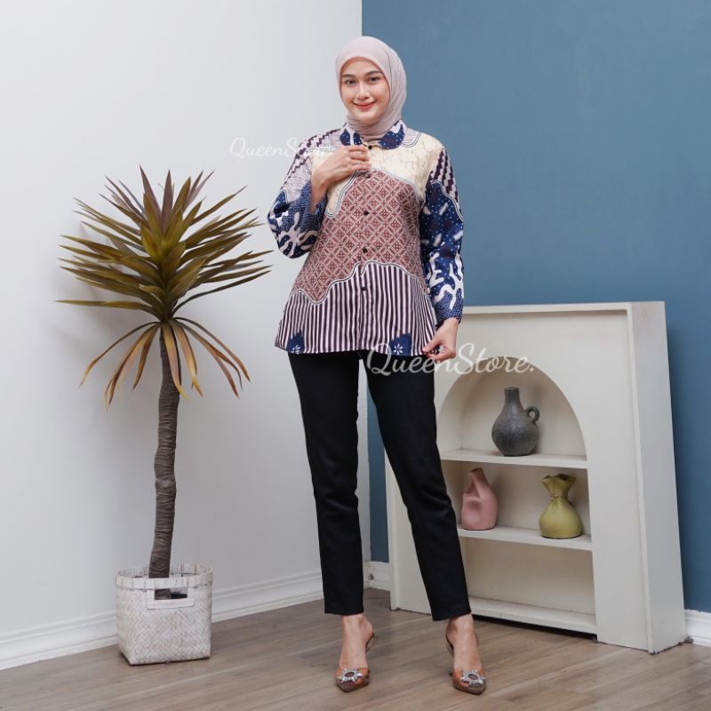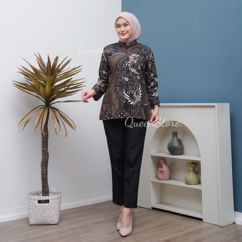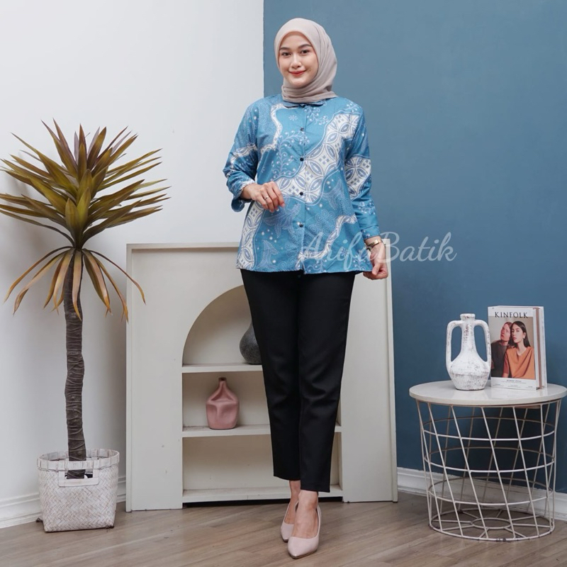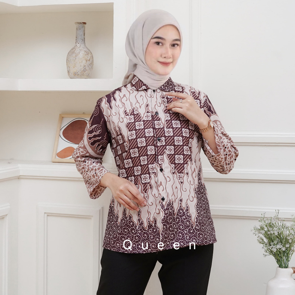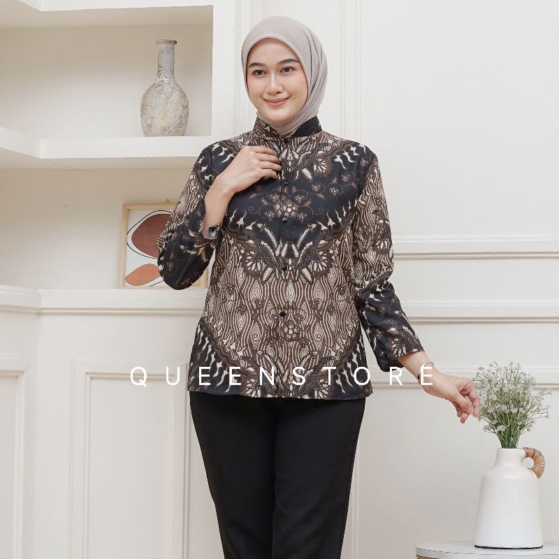 Atasan Blus Batik Wanita Lengan Panjang, Depan Full Kancing Berkerah Ready New Motif BLUS KANTOR,BLUS KERJA,BLUS KU