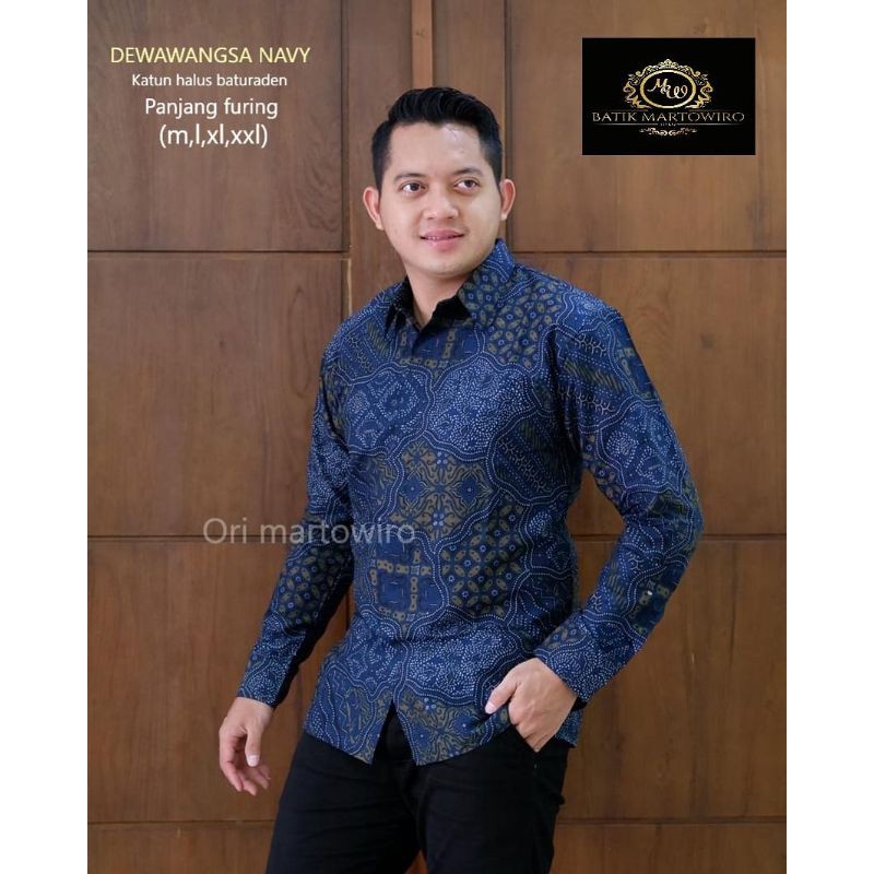 DEWA WANGSA NAVY Kemeja Batik Pria Modern Lengan Panjang Pendek Full Furing - Baju Hem Batik Pria Solo Biru Navy