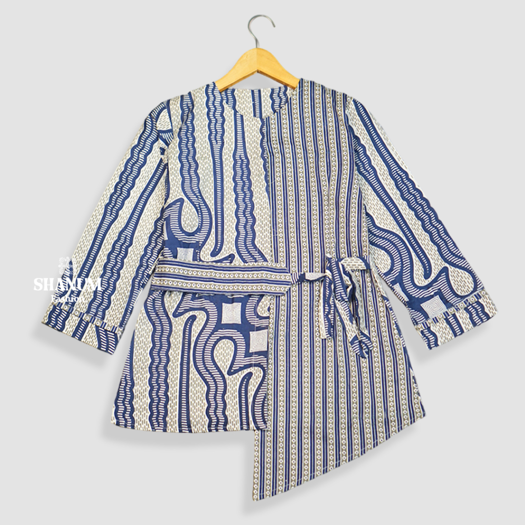 SHANUM Batik Kerja Wanita Modern Lengan 3/4 Panjang Motif Songket Tenun Bahan Katun Kombinasi Polos Tali Serut Blou