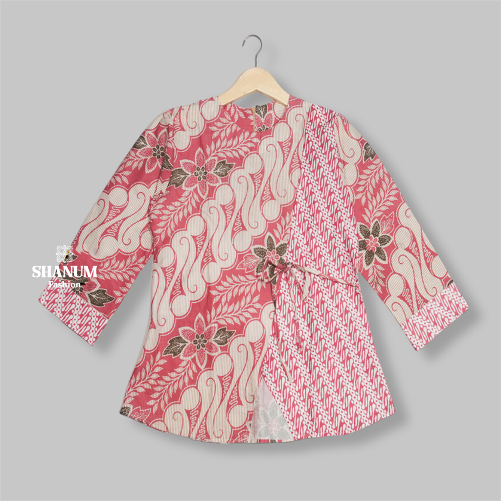 SHANUM Batik Wanita Modern Kerja Lengan 3/4 Kancing Depan Bahan Katun Premium Kombinasi Polos Blouse Monalisa Genes