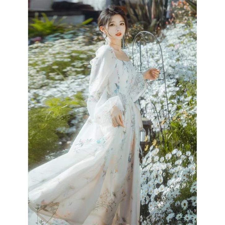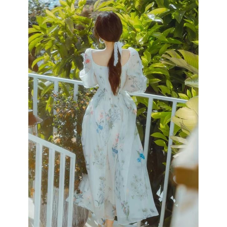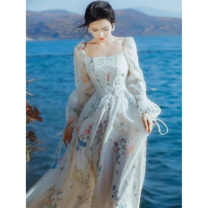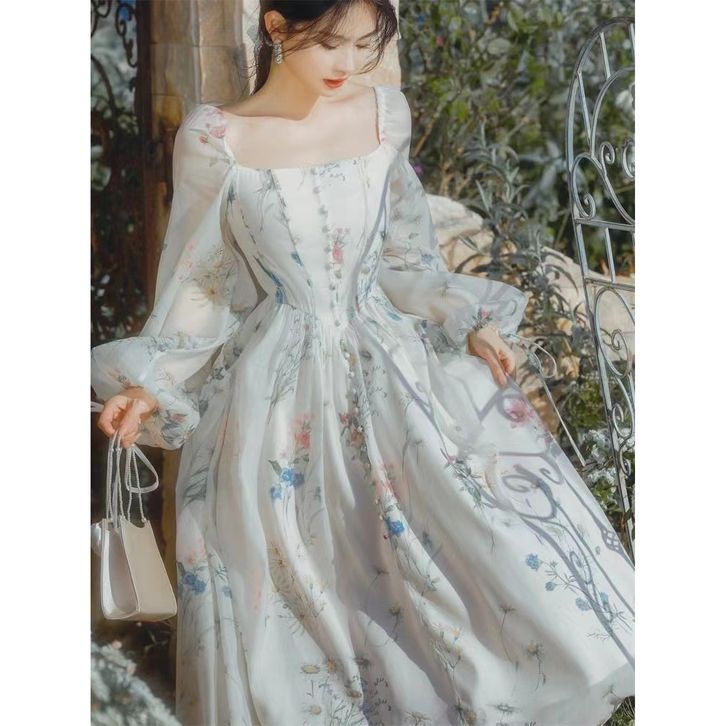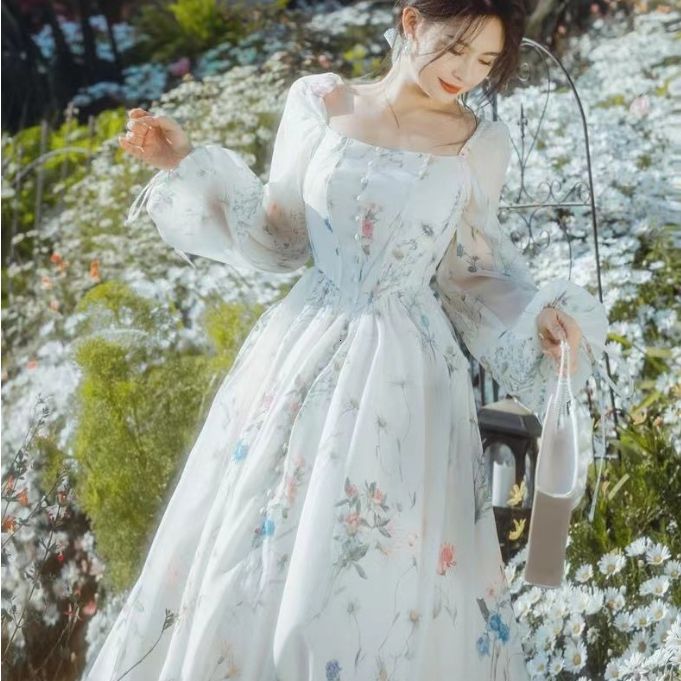 dress smile long dress pesta french square neck long sleeve dress putih fairy floral dress m649