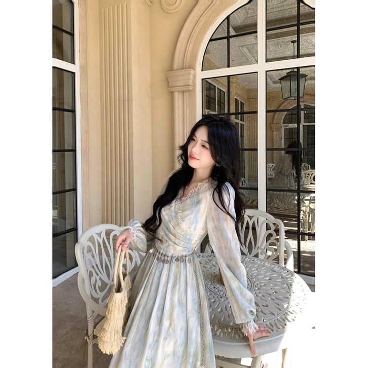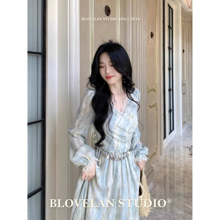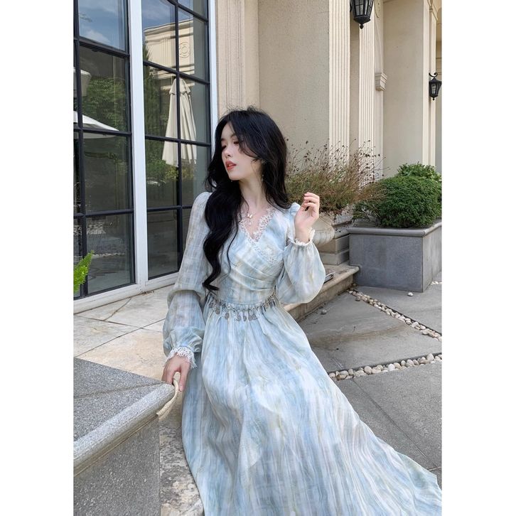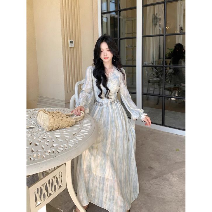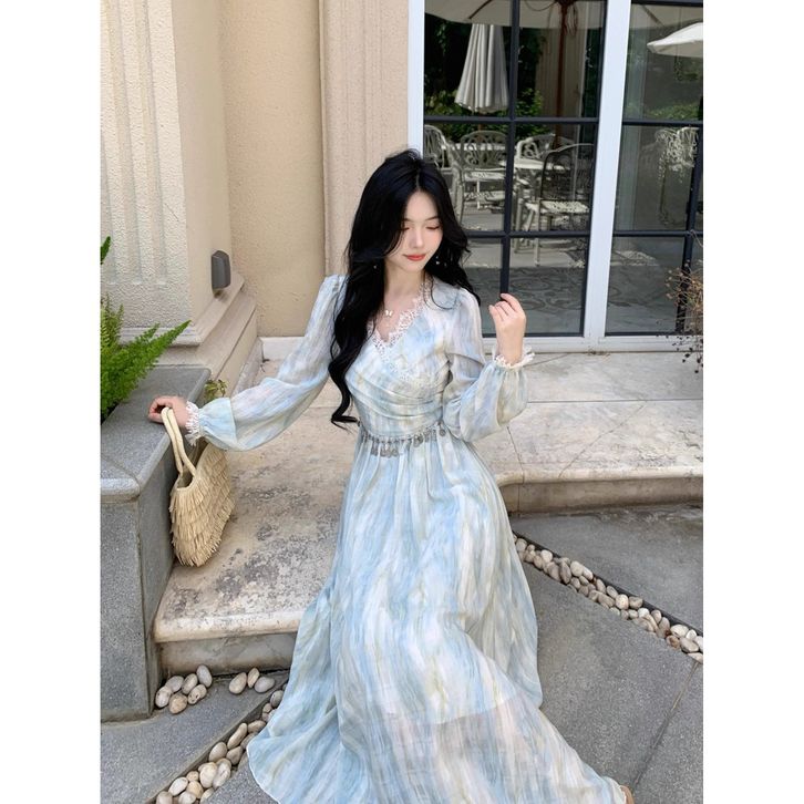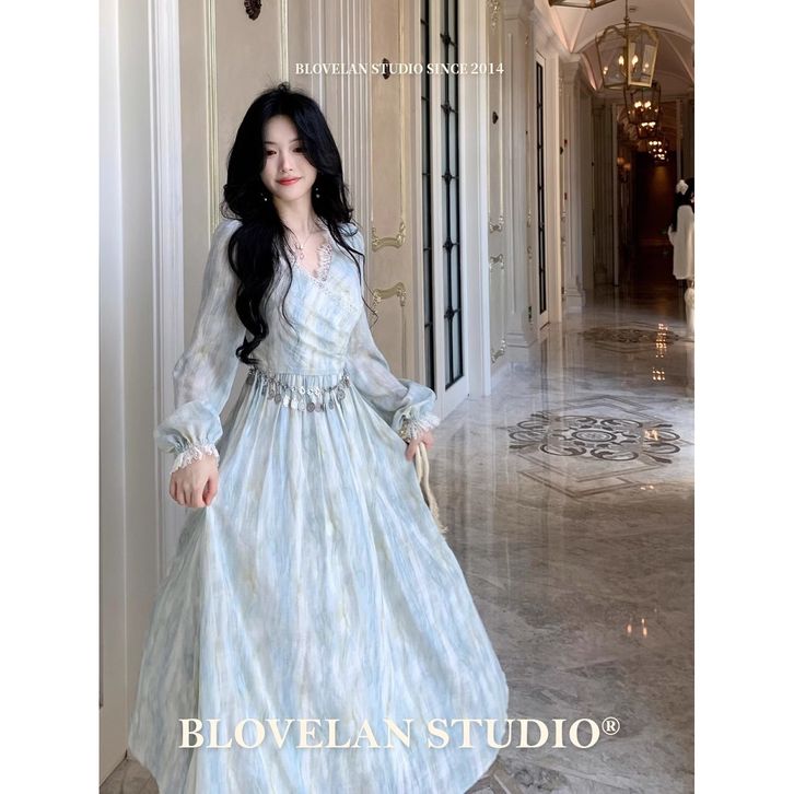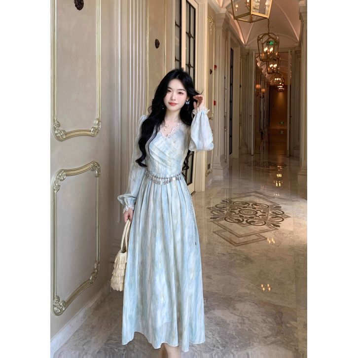 gaun lengan panjang v-neck berenda tie-dye biru yang bertemperamen