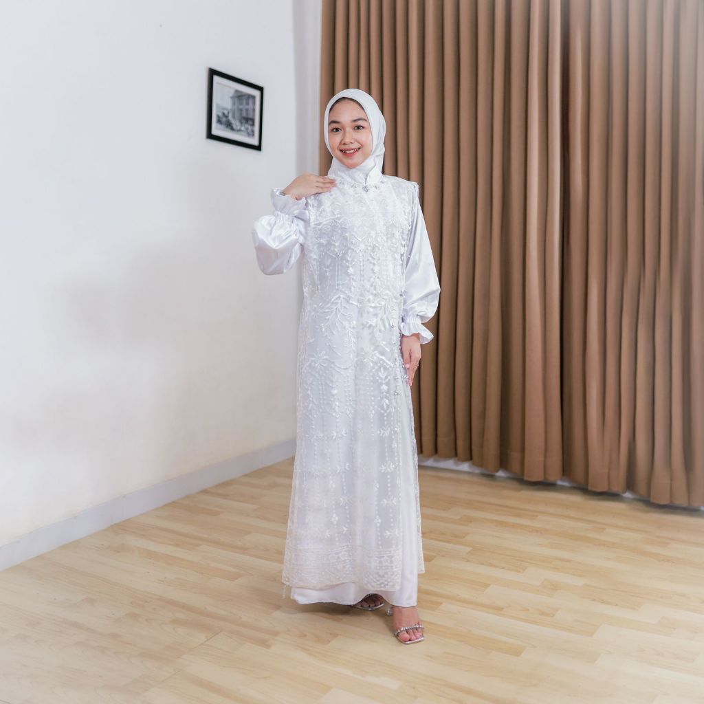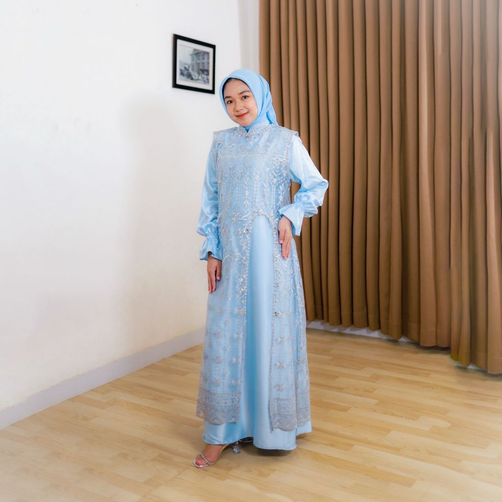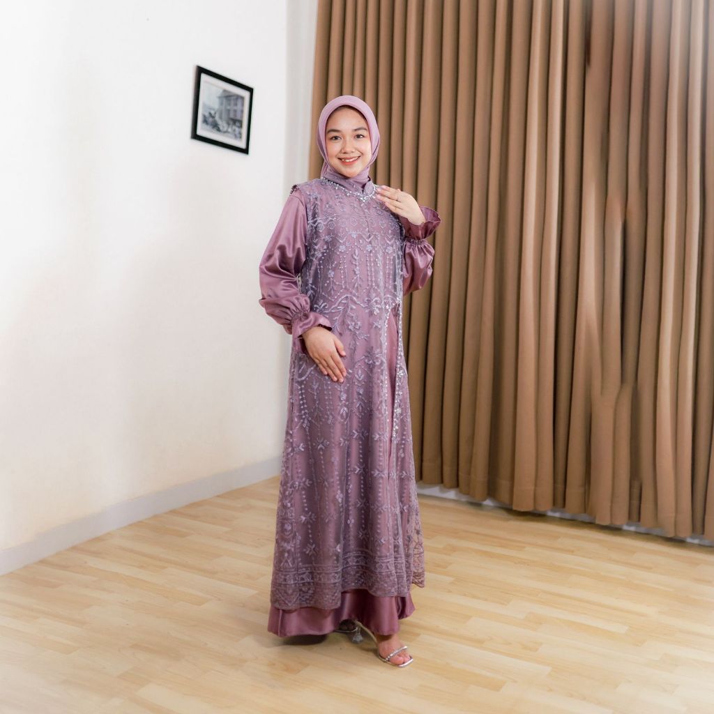 Marsya Dress Silk Burgandy Set Outer Brukat Aplikasi Payet Mutiara Gamis Pesta Wanita Kekinian OOTD