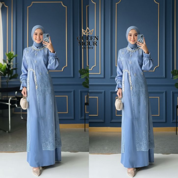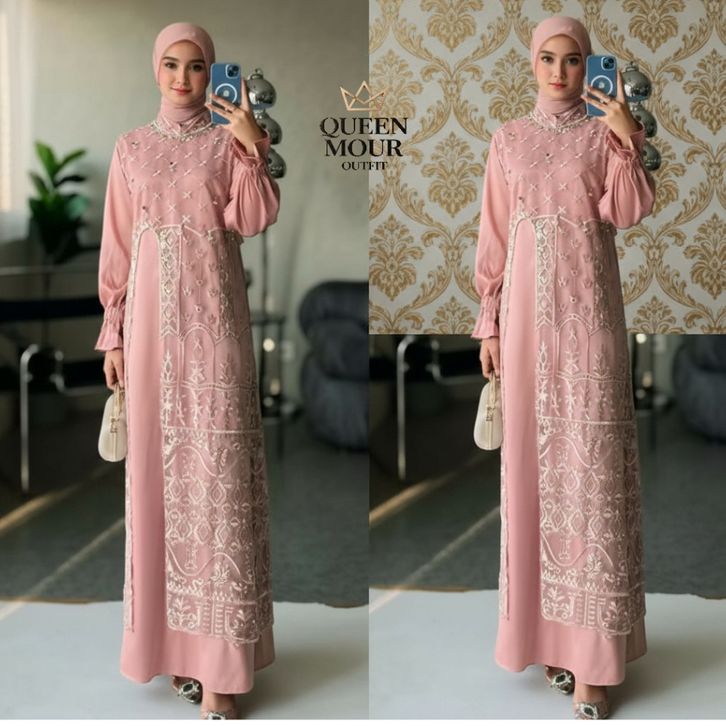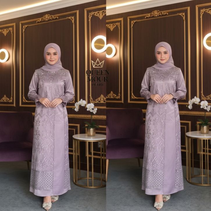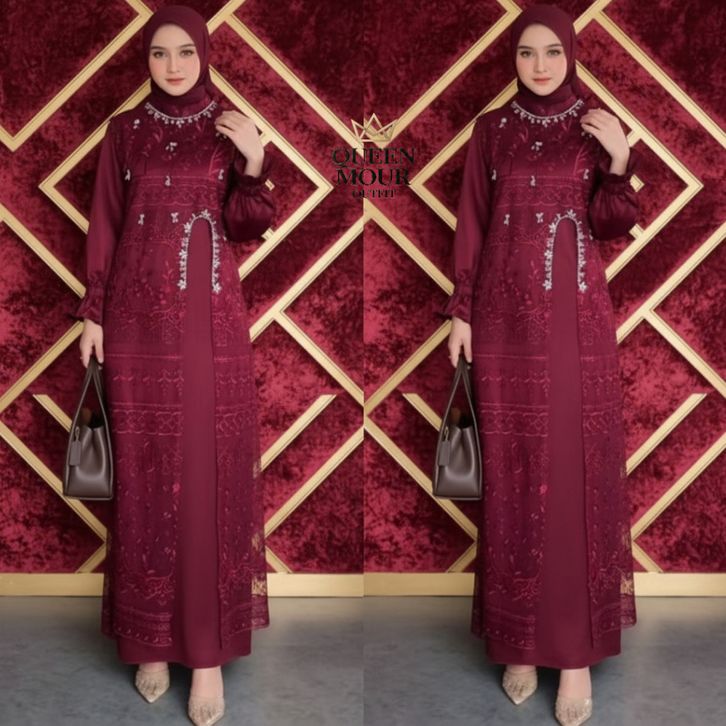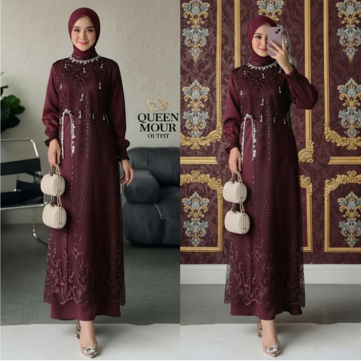 Baju Kondangan Wanita - Dress Silk Burgandy Set Outer Brukat Mutiara Gamis Pesta Wanita Kekinian OOTD - GAMIS - DRES