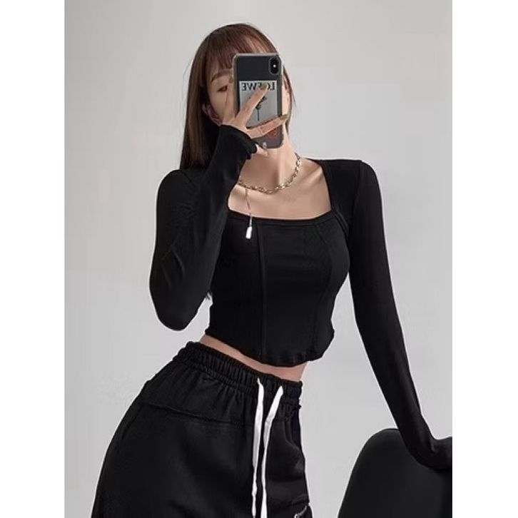 Maggie Kaos Crop Lengan Panjang Leher Kotak Crop Top Long Sleeve Terbaru