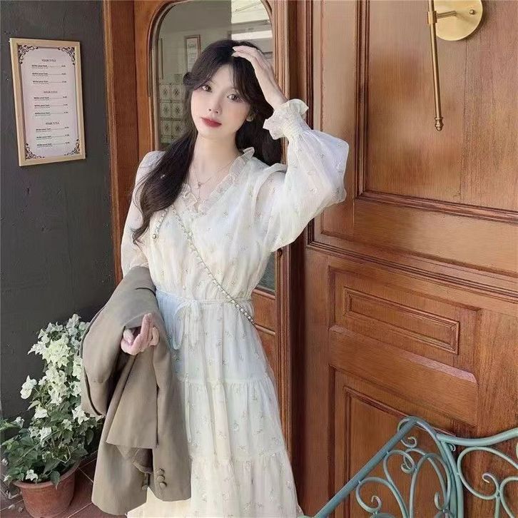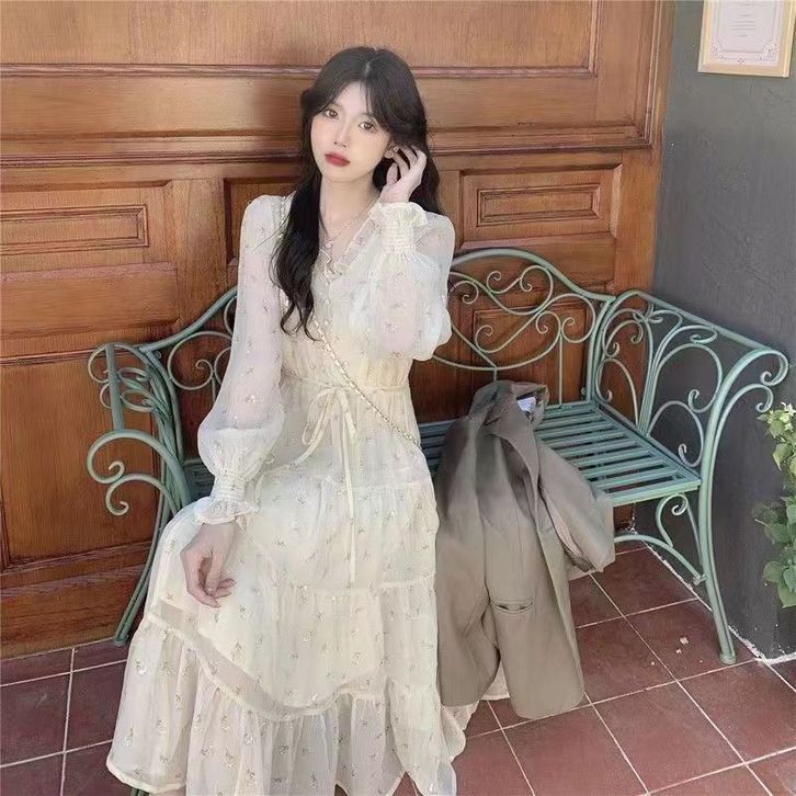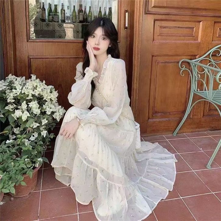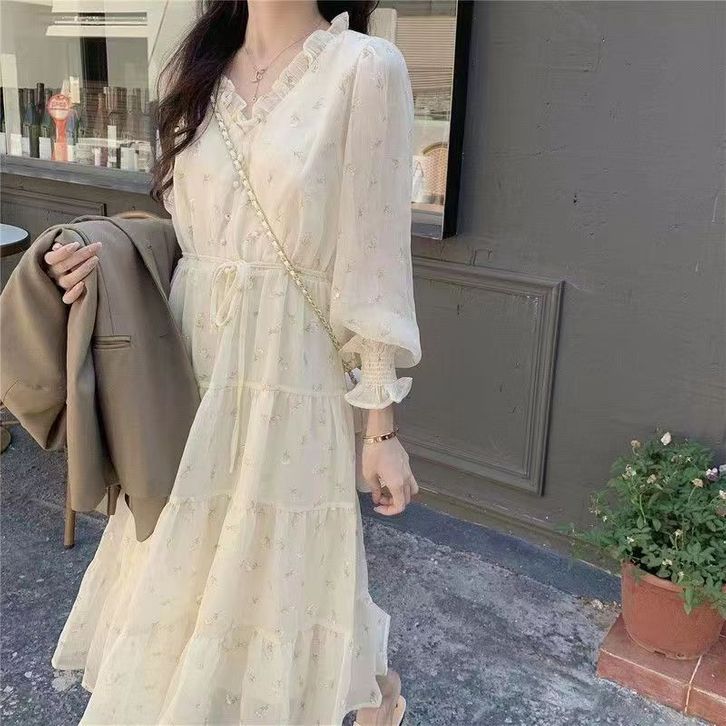 gaun ruffle mid-length motif bunga sifon niche v-neck k007