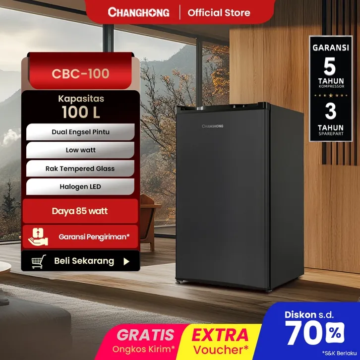 CHANGHONG KULKAS 1‑PINTU CBC100 BLACK – 100 L KAPASITAS – DESAIN COMPACT & HEMAT ENERGI RAK ANTI BOCOR BARU BERKUALITAS