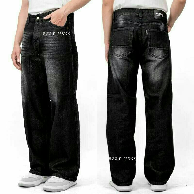 Celana Jeans Panjang Pria Skena Wide Leg Black Wishker Basic Baggy Pants Lebar Gombrong Hitam Pria Lost Fit Jumbo Big Size S - 3Xl (28-38) Bahan Denim Non stretch 13 OZ