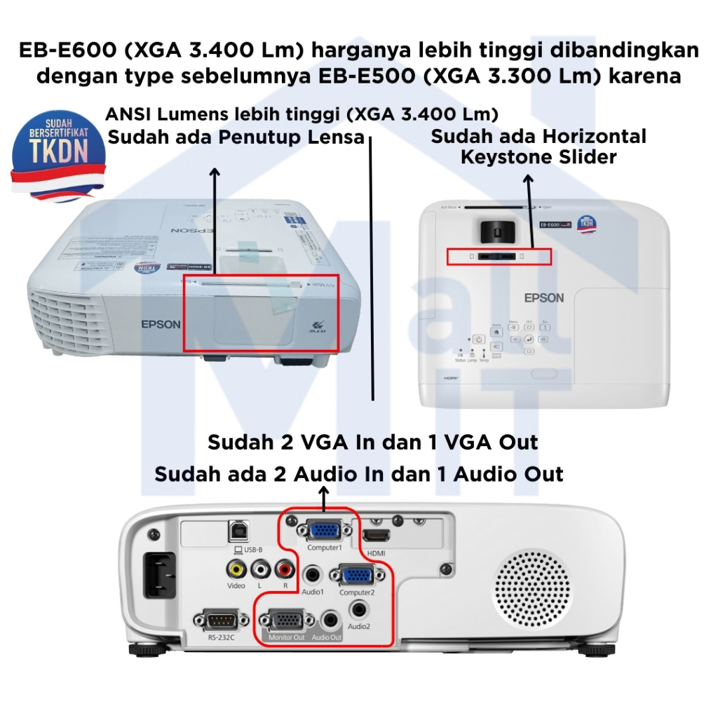MALLIT EPSON PROYEKTOR EPSON EB-E600 EBE600 EB E600 XGA 3LCD 3400 LUMENS TKDN PENGGANTI EB-E500 E500 RESMI JAKARTA