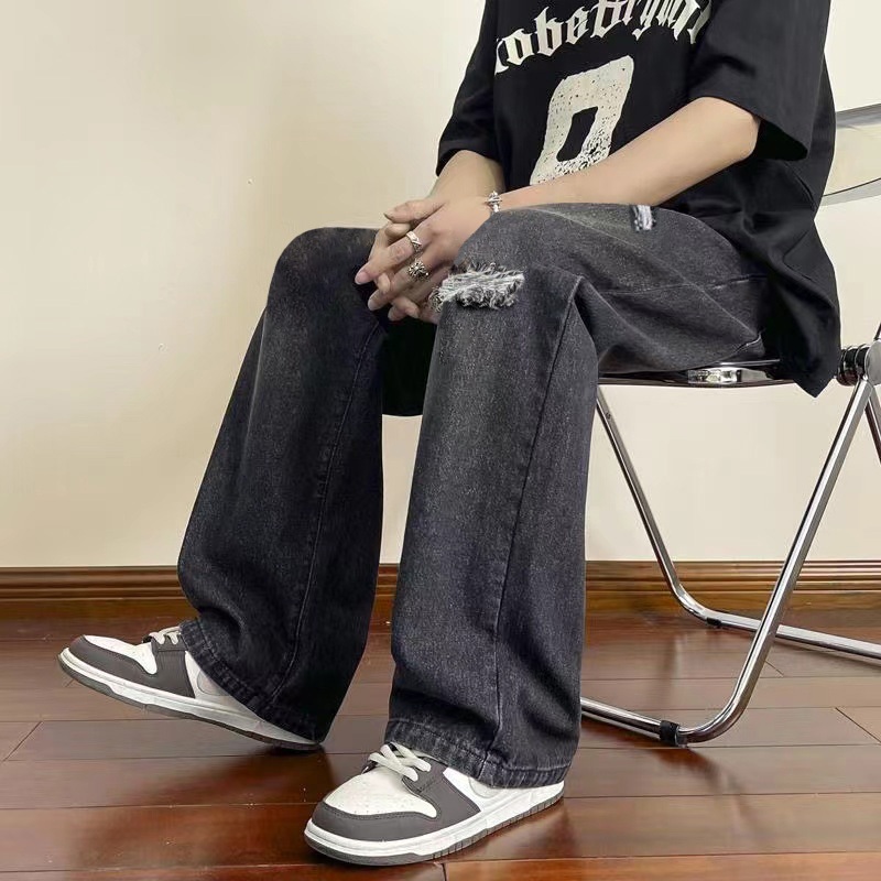 KeyBoy celana jeans pria panjang sobek baggy straight hitam denim pants casual longgar pants korean style