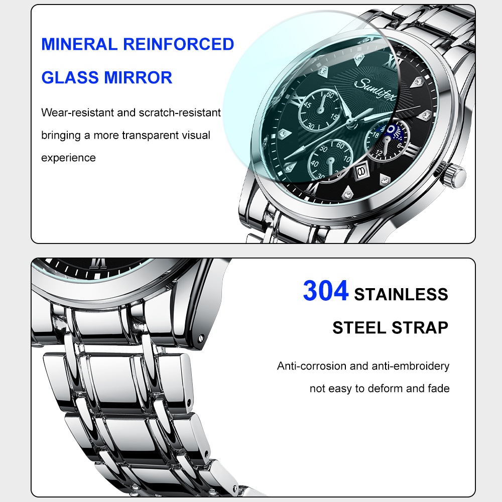 Sunlifex Jam Tangan Pria Original 9004A Kuarsa Calendar Tali Stainless Steel Mode Santai Jam Tangan Cowok