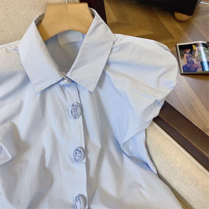 【READY】Kemeja biru lengan terbang wanita musim panas kerah polo kerah mawar blus atasan Prancis - Fashion