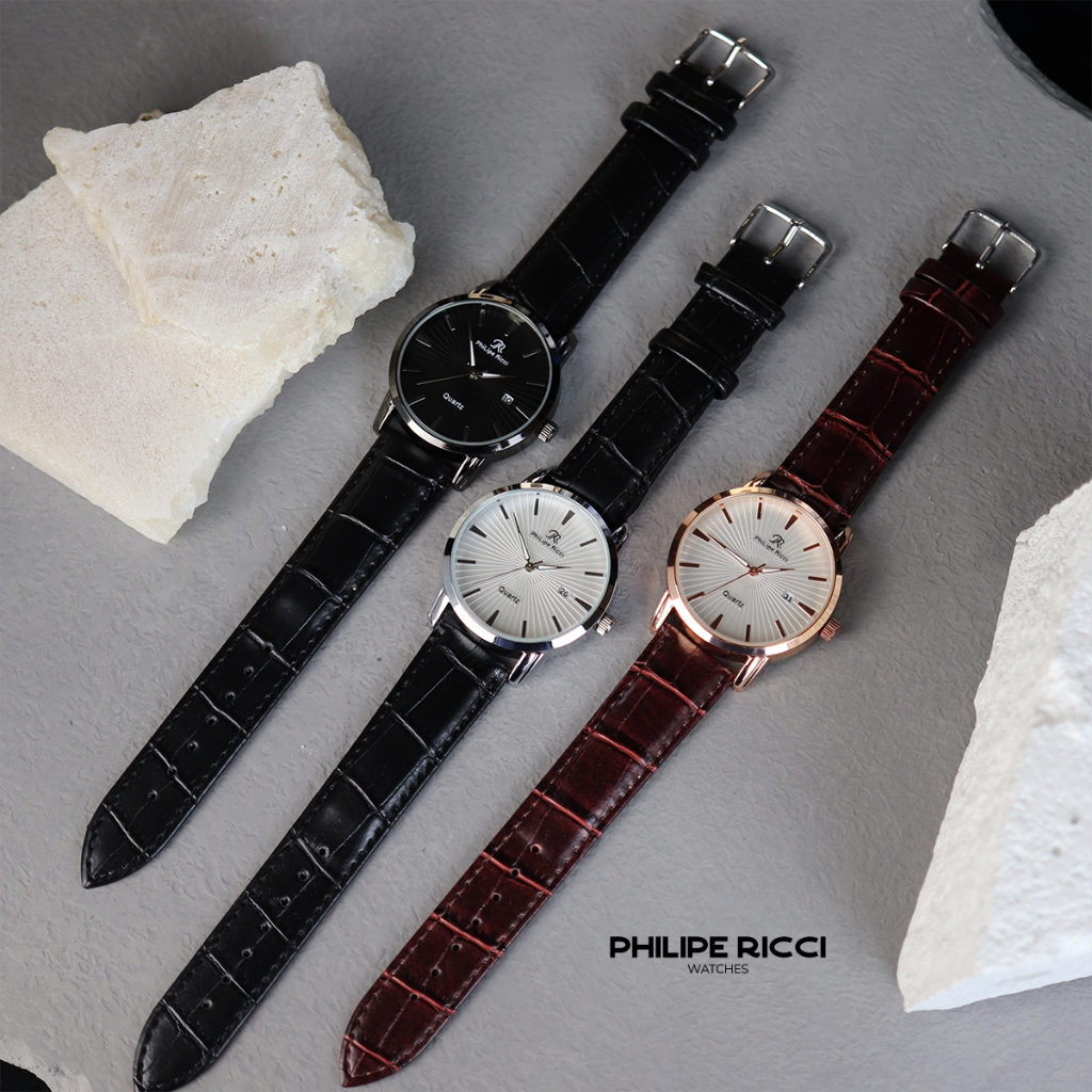 PhiLipe Ricci Jam Tangan Pria Kulit Analog Quartz Strap Leather Dial Bulat Besar Model Terbaru 4237 Man Watches Splash Resist Free Box Dan Baterai