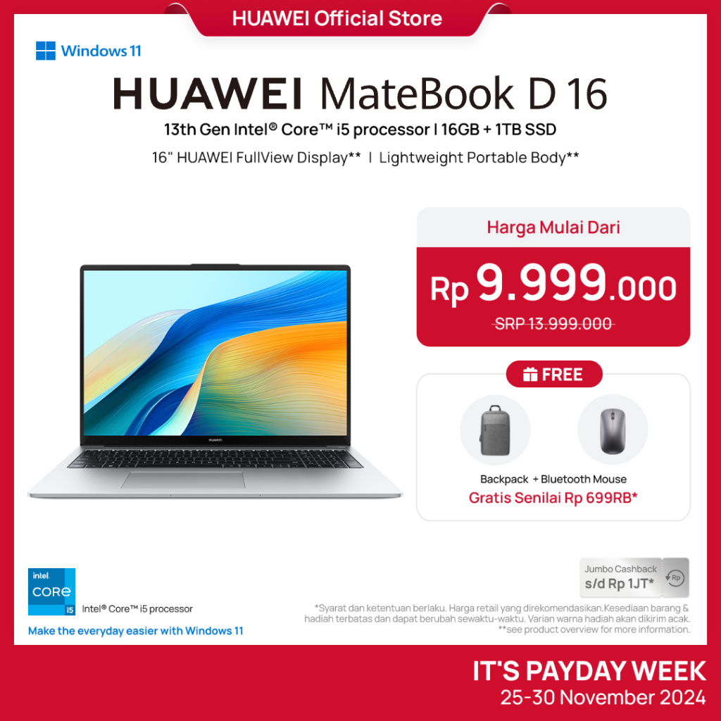 [Free Bag + Mouse] HUAWEI MateBook D 16 Laptop | 16GB + 1TB | Up to Intel® Core™ i9-13900H | 70Wh Battery