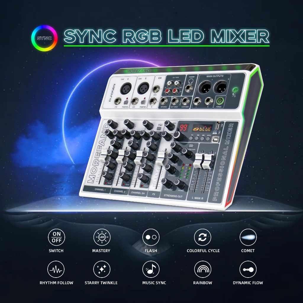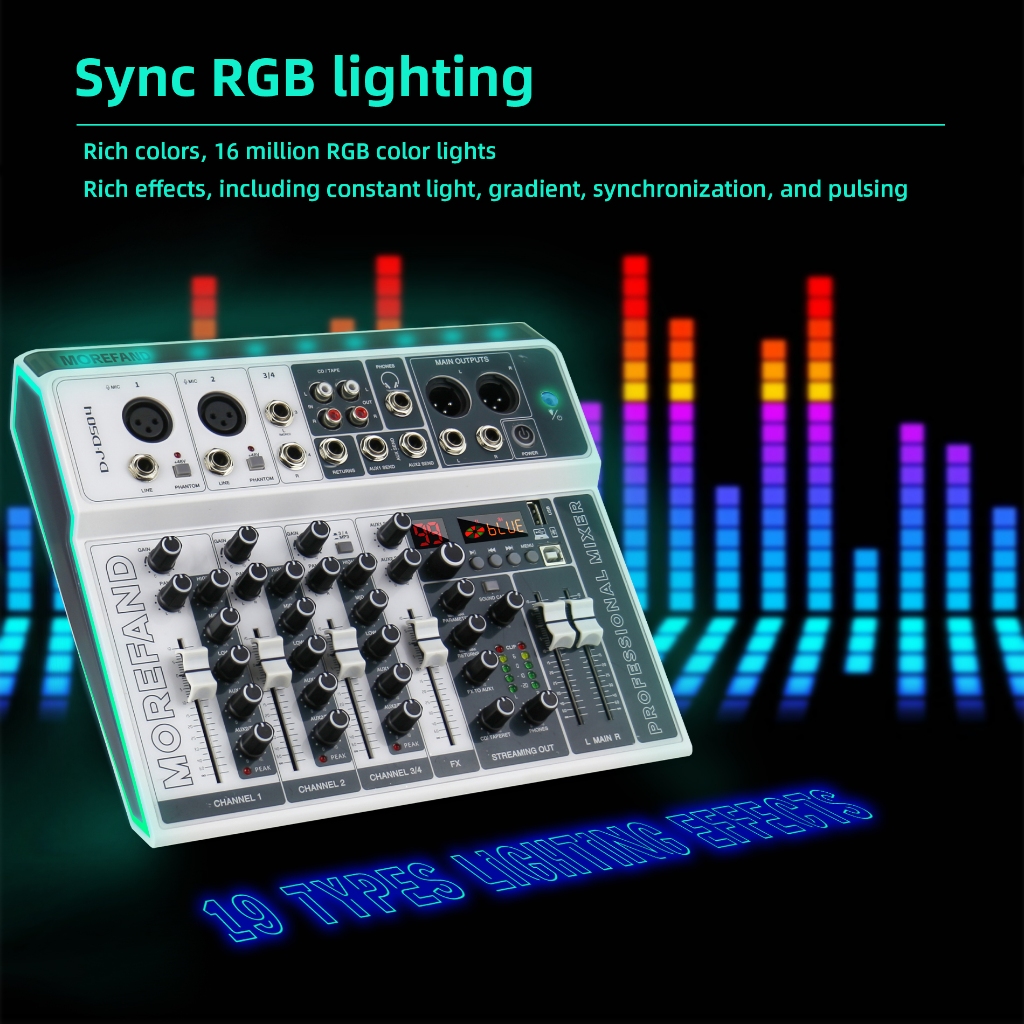 MOREFAND DJ-DS04 99DSP EQ mixer audio 12V 4 channel mendukung USB/Electro Bluetooth 48v Phantom power DJ Audio