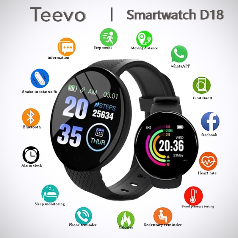 Teevo SmartWatch D18 Jam Tangan Pintar Olahraga Pria Dan Wanita Android IOS Bluetooth Digital Jam Tahan Air Heart Rate Smart Watch