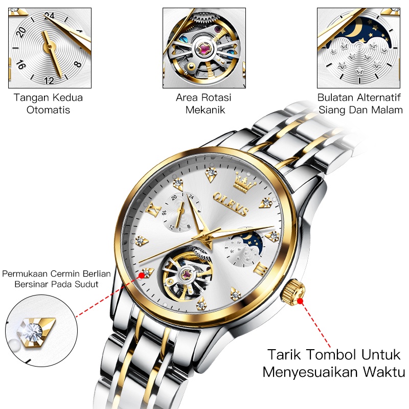 OLEVS Jam Tangan Automatic Wanita Original Anti Air Terbaru 2024 Korea Elegan Luxury Branded Biru Putih Women Watch