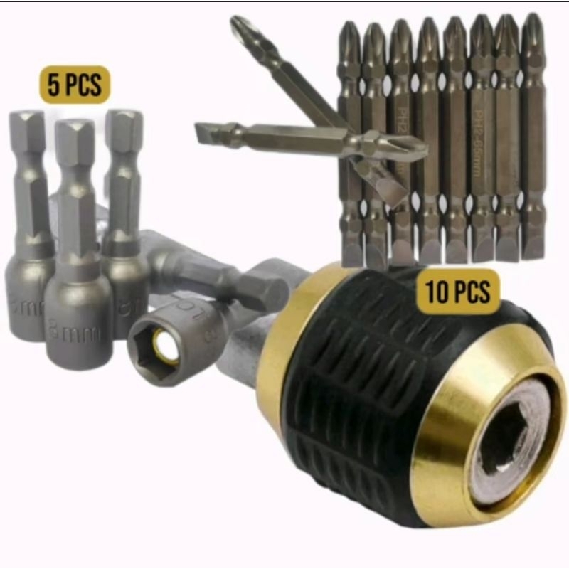 PAKET SET 16PCS KEYLESS KEPALA BOR HEXAGONAL, 10PCS MATA OBENG MAGNET, 5 PCS MATA KUNCI ROOFING 8MM
