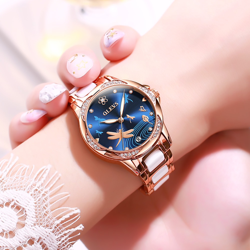 OLEVS Jam Tangan Automatic Wanita Original Anti Air Terbaru 2024 Korea Elegan Luxury Branded Biru Putih Women Watch