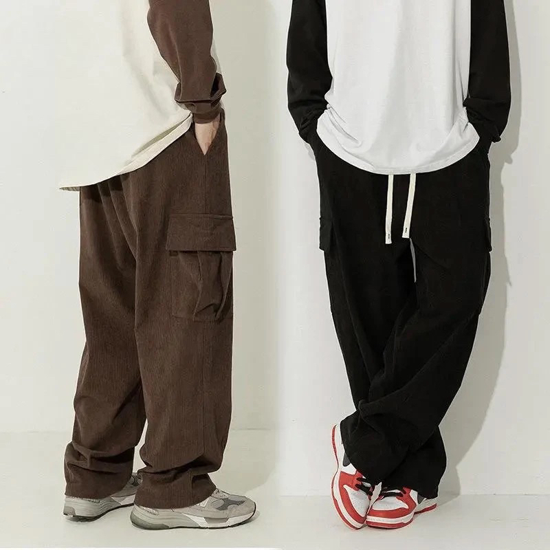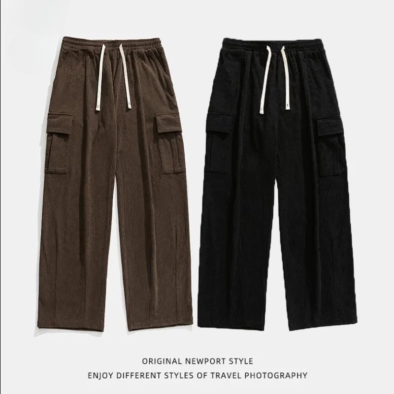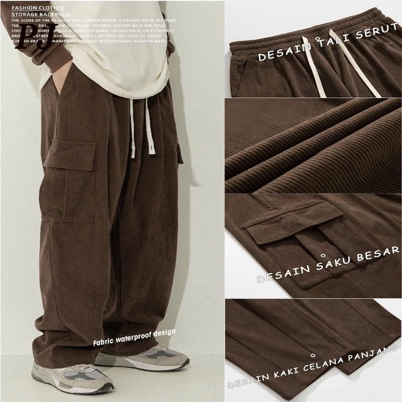 Long Cargo pants corduroy tali pinggang karet celana cargo corduroy unisex Loose Fit Reguler Standar JUMBO muat Berat badan 100kg