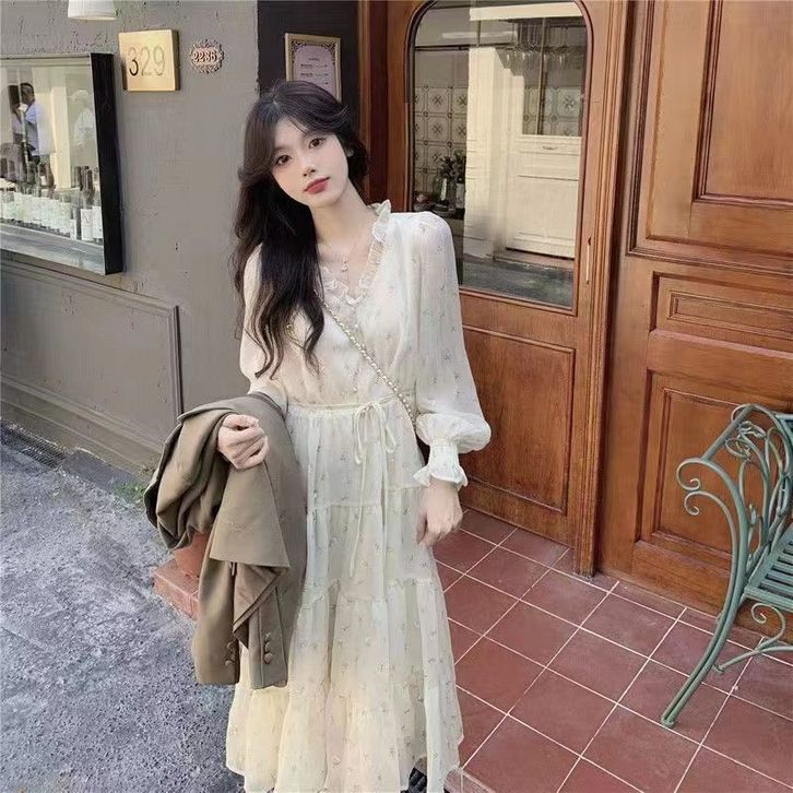 gaun ruffle mid-length motif bunga sifon niche v-neck k007