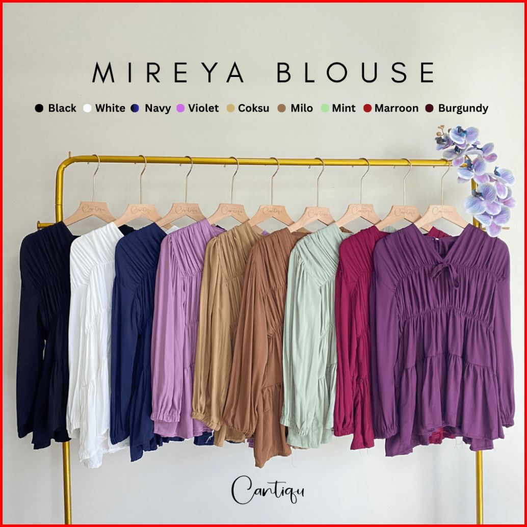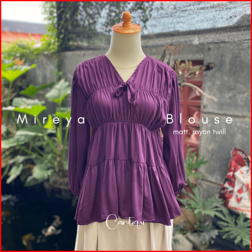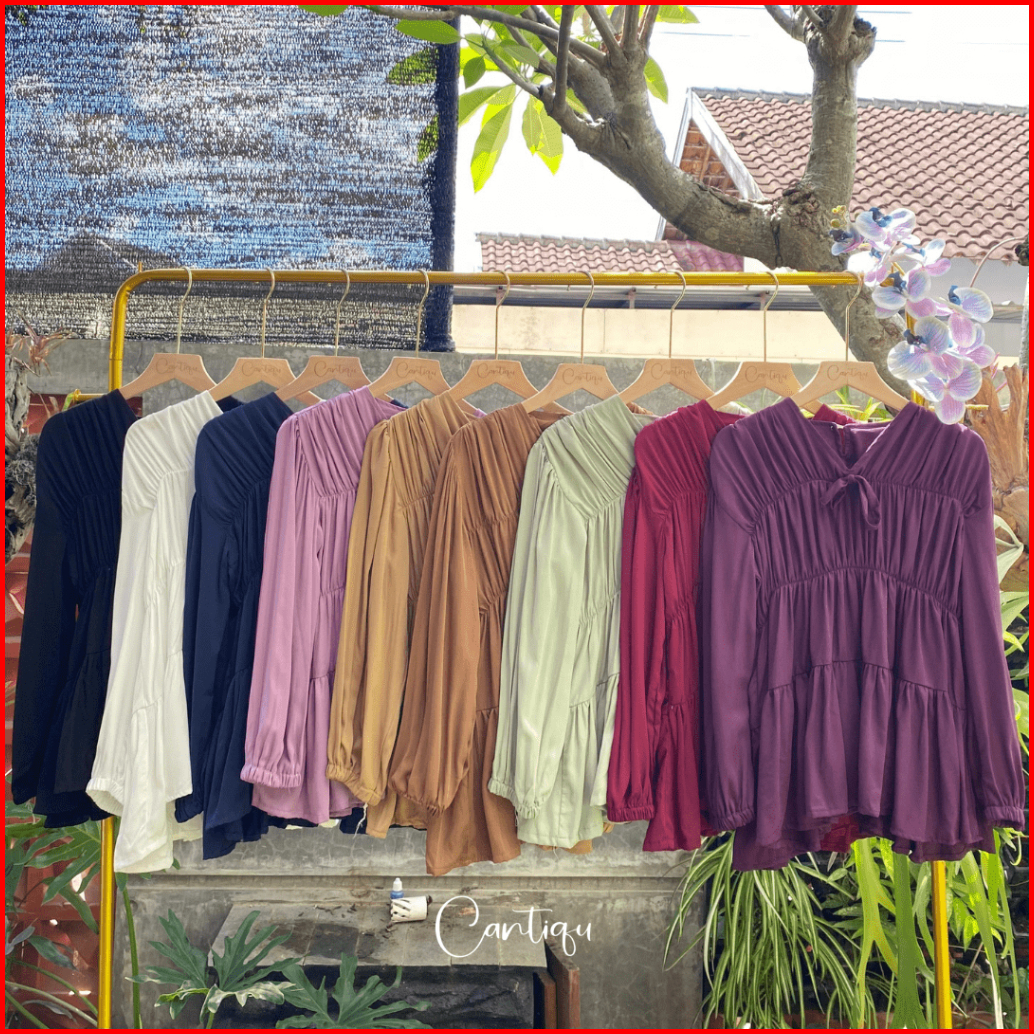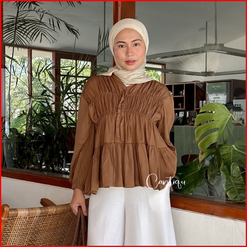 Cantiqu - Mireya Blouse Kerut Rayon Atasan Wanita Polos Warna Lengan Panjang