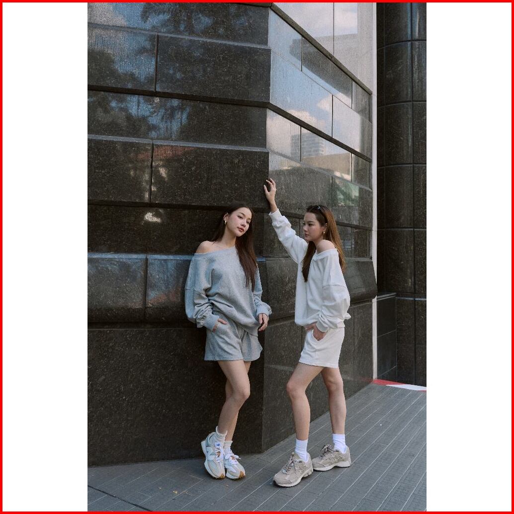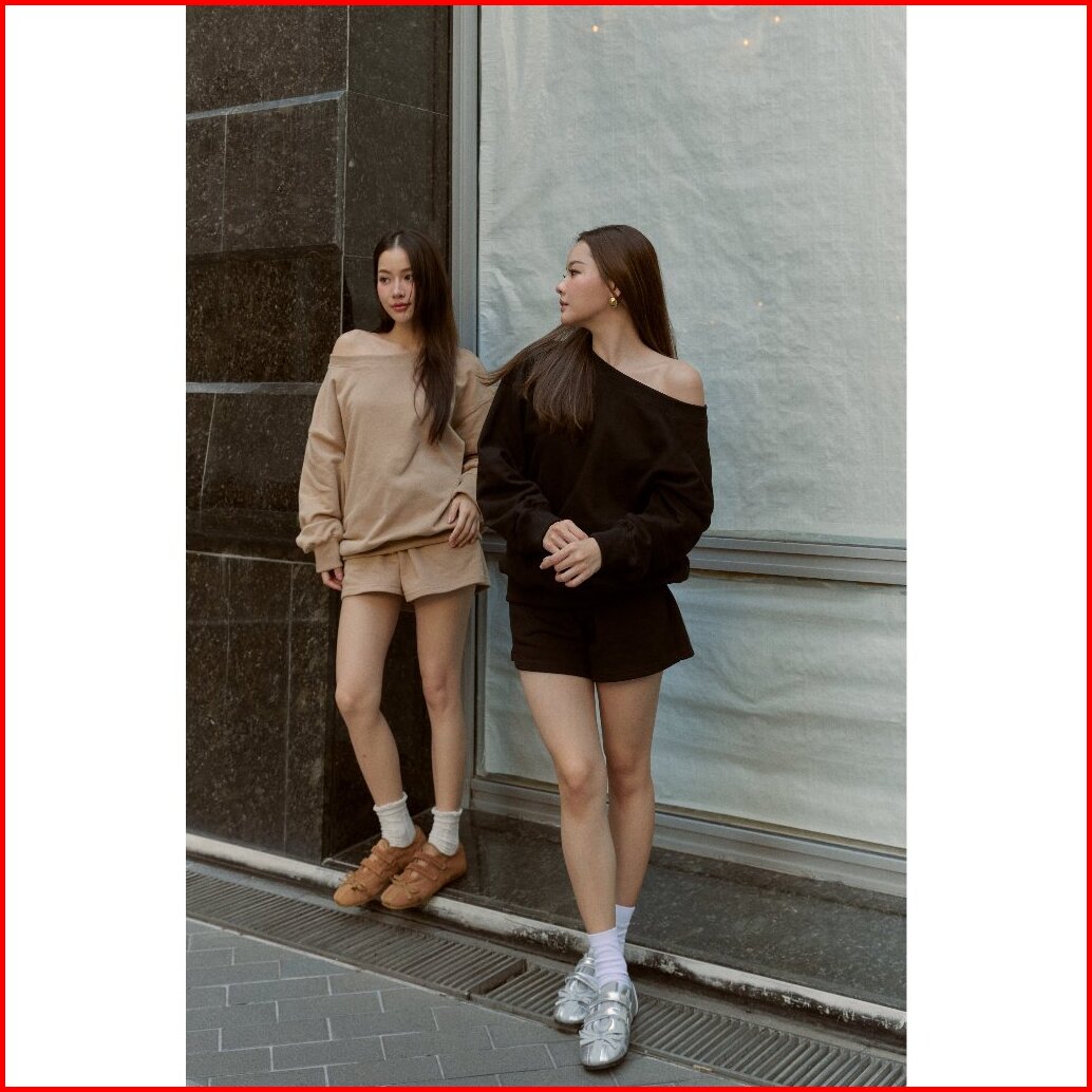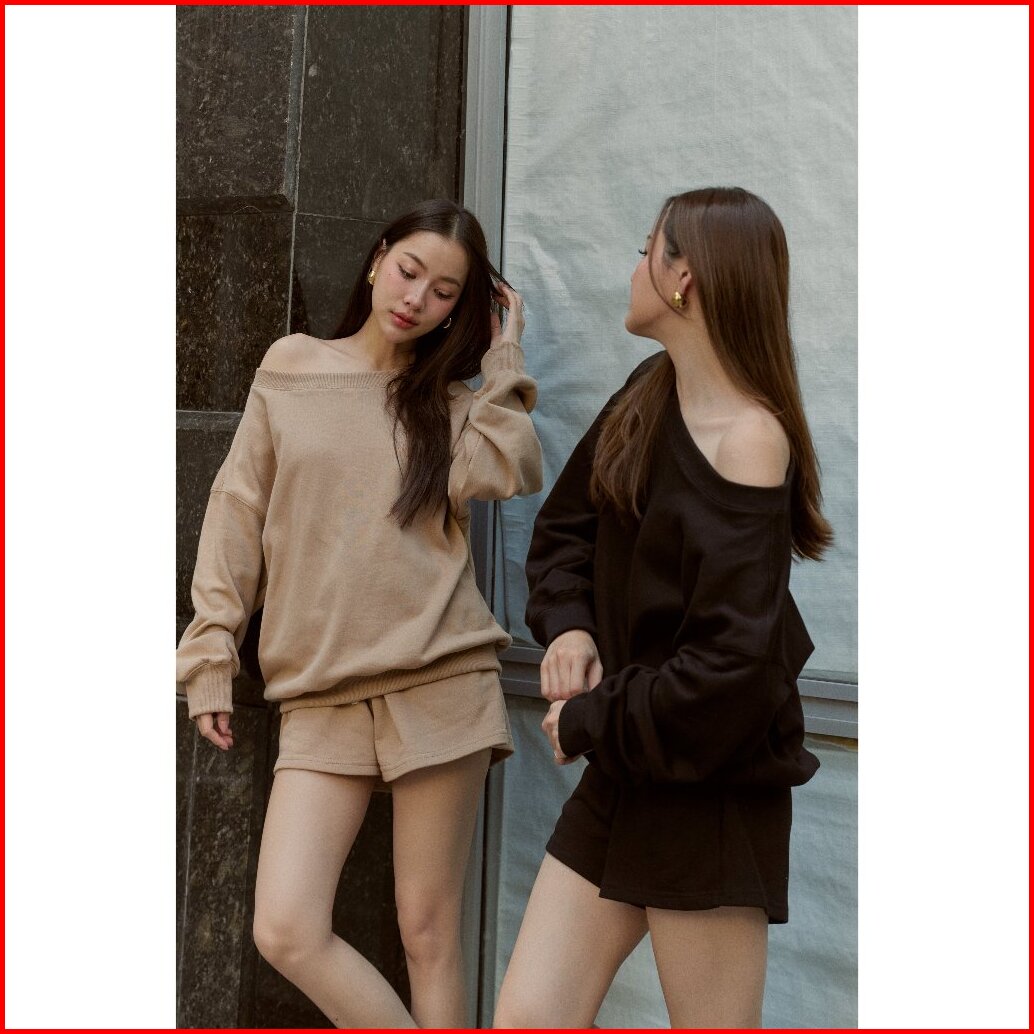 Kiyorawears - U - A Fyra Oversized Shirt Set Setelan Wanita Atasan Off Sholuder Celana Pendek Casual Sweater Basic Setel
