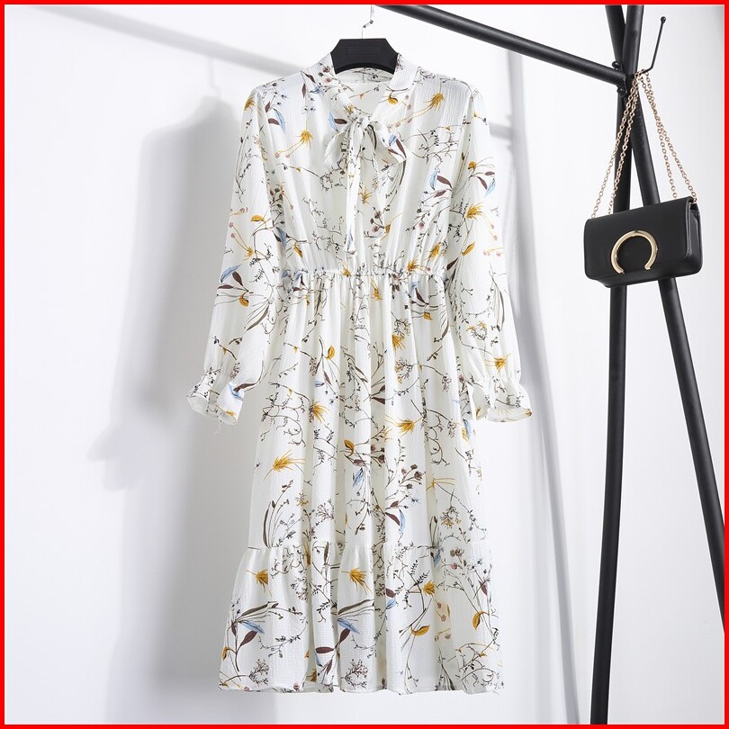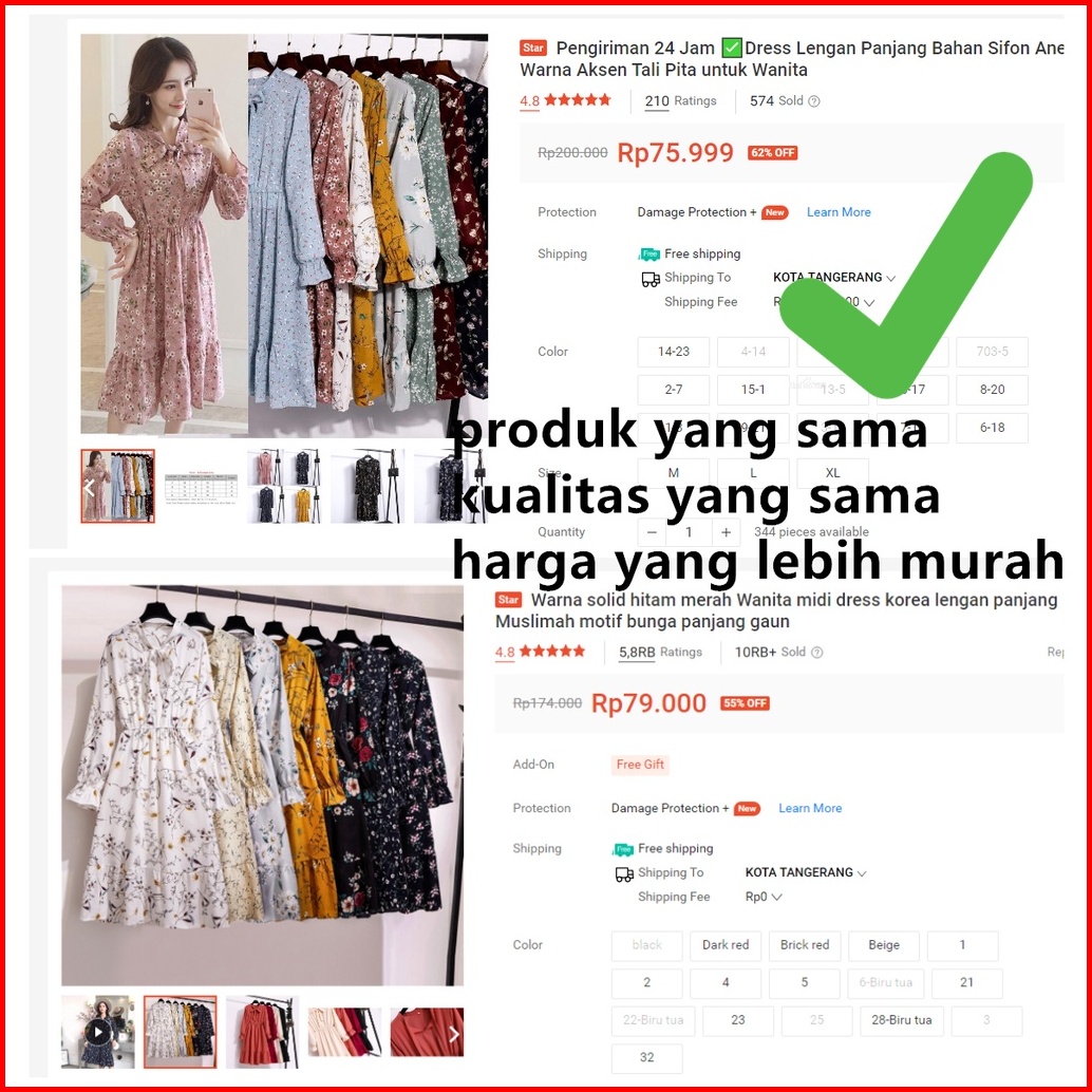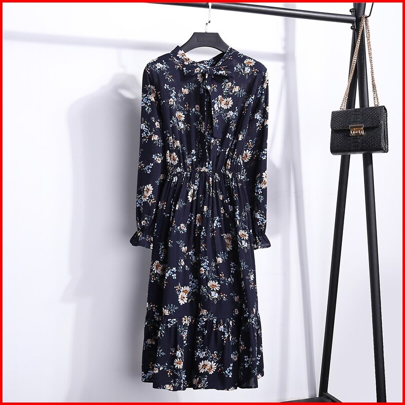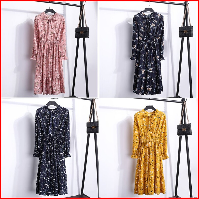 Pengiriman 24 Jam Warna Solid Hitam Merah Wanita Midi Dress Korea Lengan Panjang Muslimah Motif Bunga Panjang Gaun