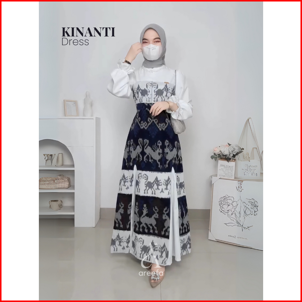 Areefa - Gamis Dress Etnik Tenun Premium Remaja Wanita Warna Putih Navy Gamis Tenun Etnik Kombinasi
