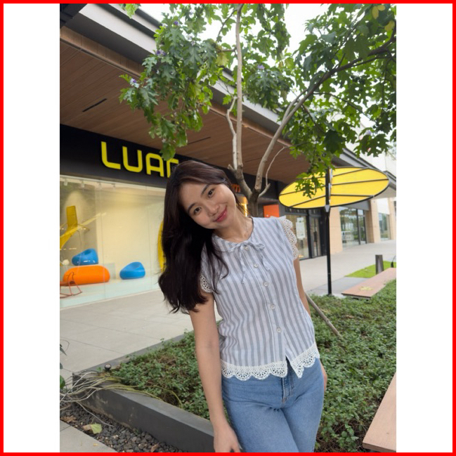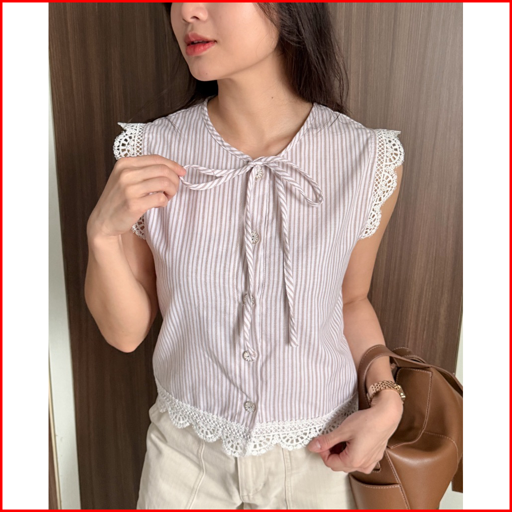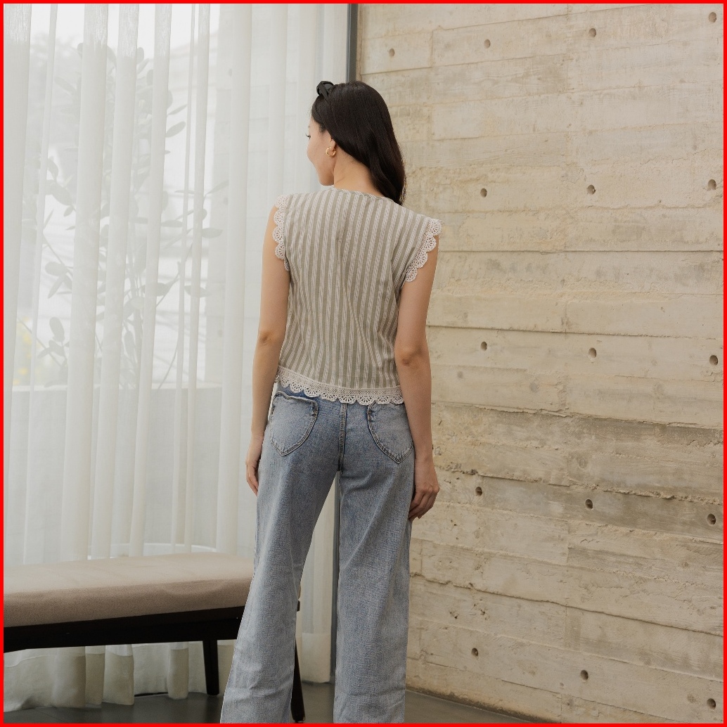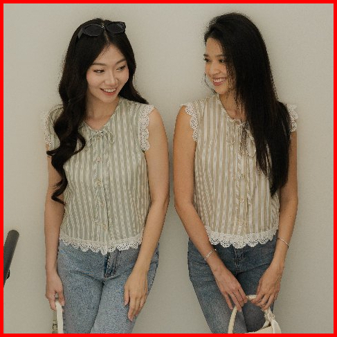 Eunji S Vault Seoul Lace Stripes Sleeveless Top Atasan Wanita Casual Korean Style Motif Salur