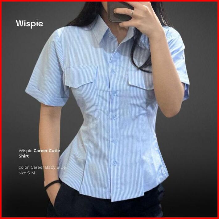Wispie Career Cutie Fitted Shirt Atasan Kemeja Top Fit Body Wanita Tanpa Tali Motif Salur Lembut