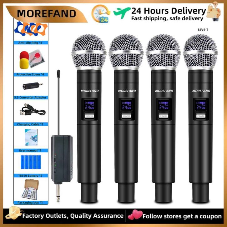 MOREFAND Mic Wireless Drag Four Hitam | Mikrofon Tahan Gangguan & Tahan Lama | UHF Profesional untuk Rekaman & Live Show
