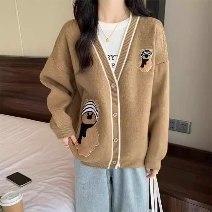 TERBARU QUIRINO - Cardigan rajutan longgar dan serbaguna dengan bordir beruang gaya Korea ecosk