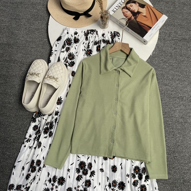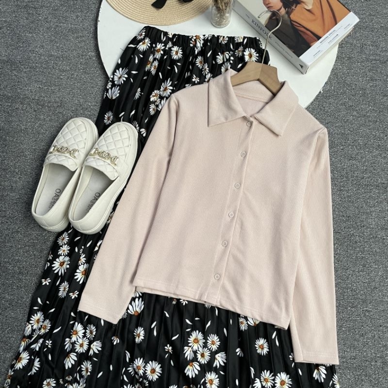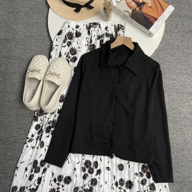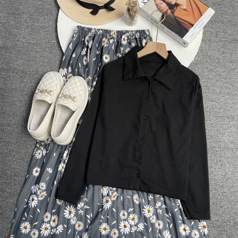 One Set Setelan Wanita Kekinian Blouse Kerut Rok Plisket Bunga Kiyowo Lucu Korean Syle Baju Basic Casual Kuliah Kerja