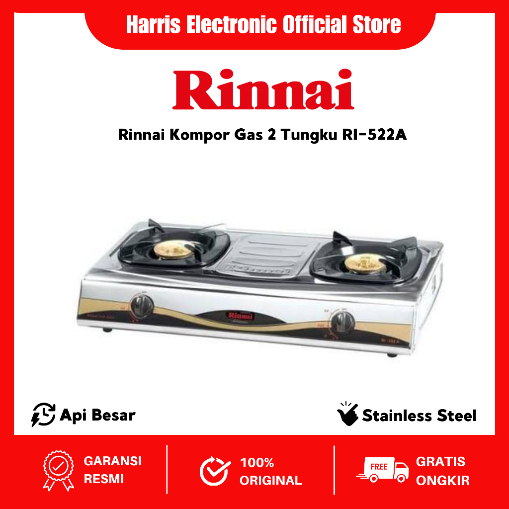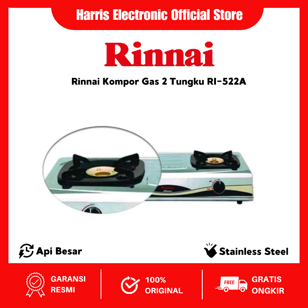 RINNAI KOMPOR GAS 2 TUNGKU RI522A / RI 522 A STAINLESS STEEL GARANSI RESMI / KOMPOR RINAI 2 TUNGKU STAINLESS TERBARU