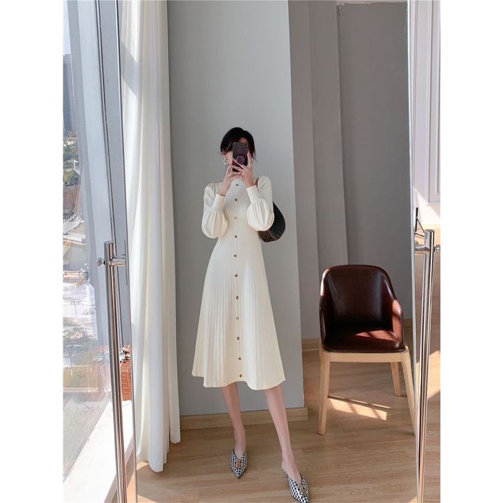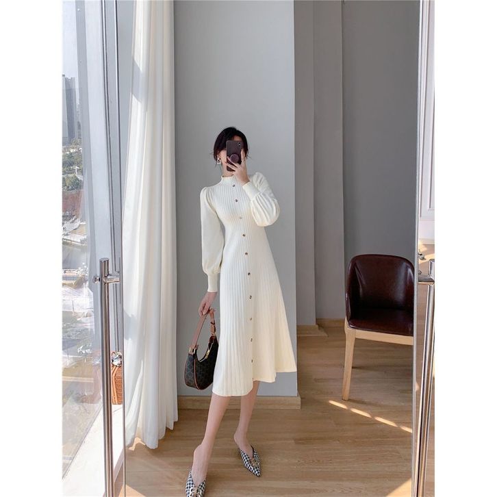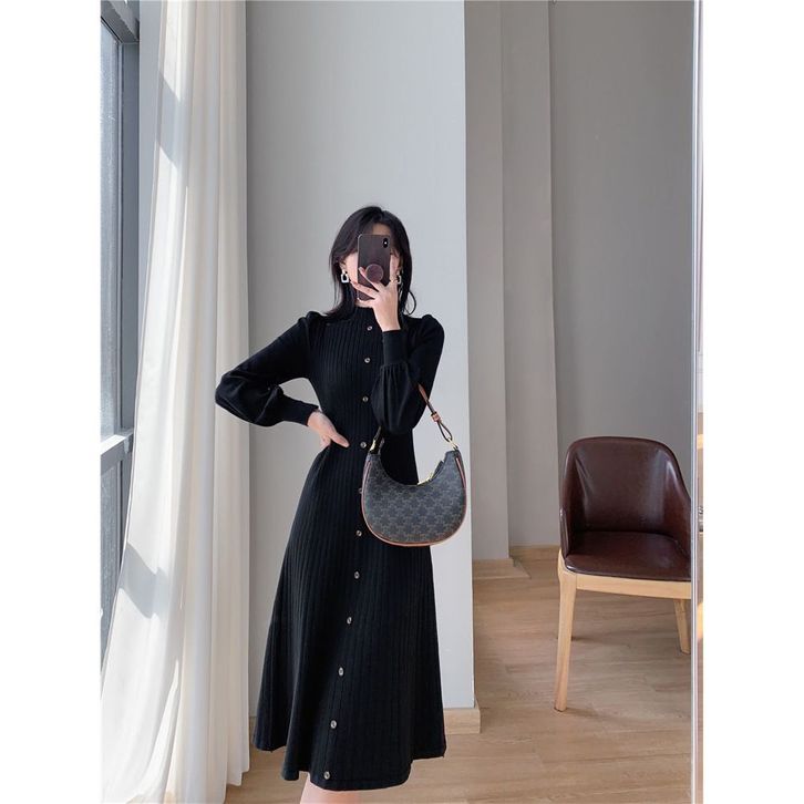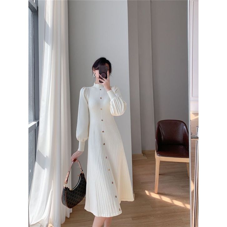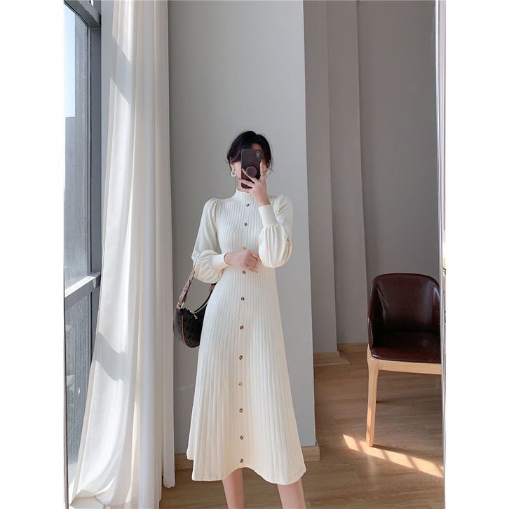 dress rajut panjang wanita gaya korea dengan leher tinggi-korean style dress