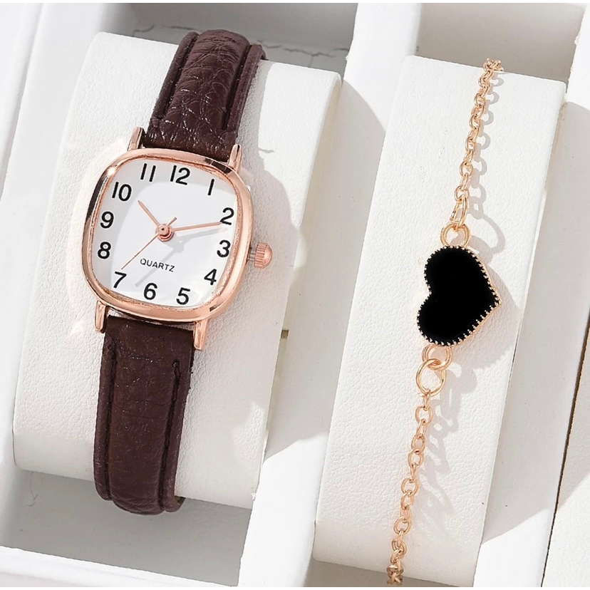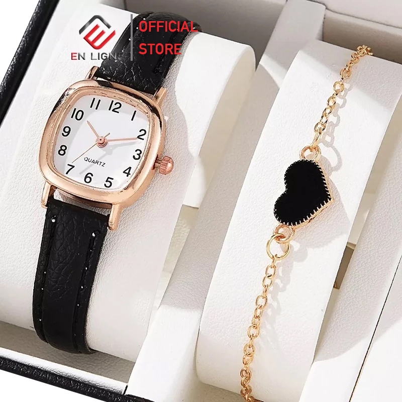 ENLIGNE - EL915 - Jam Tangan Fashion Wanita Kotak Kecil Tali Kulit - Set Gelang Bonus Box Cantik