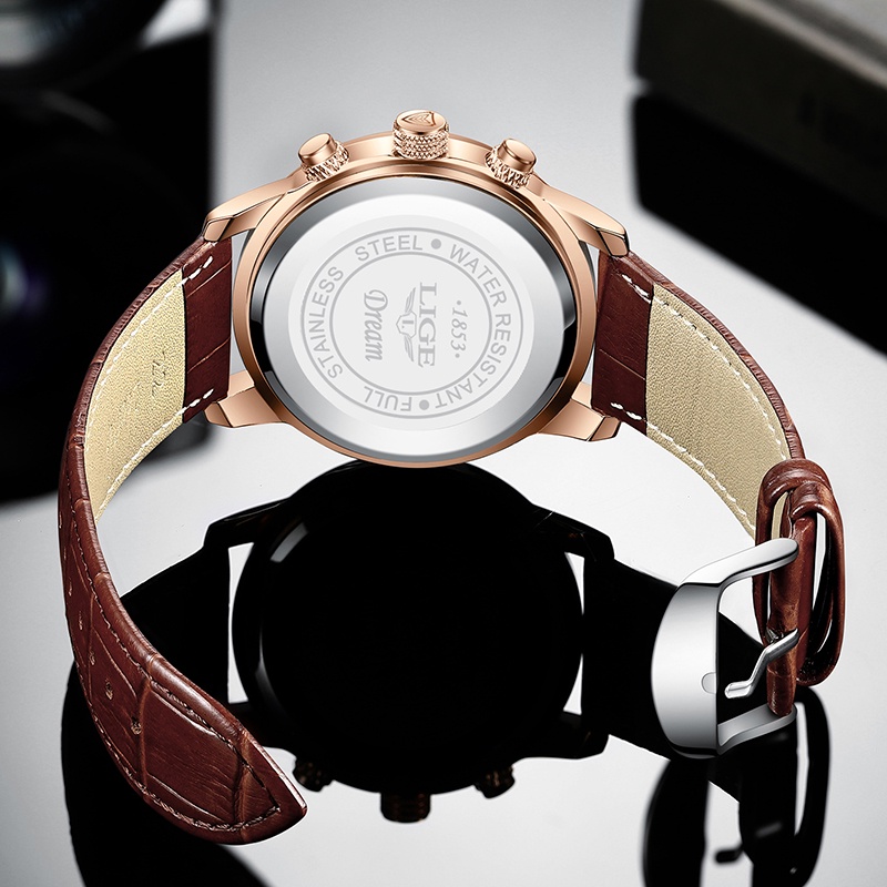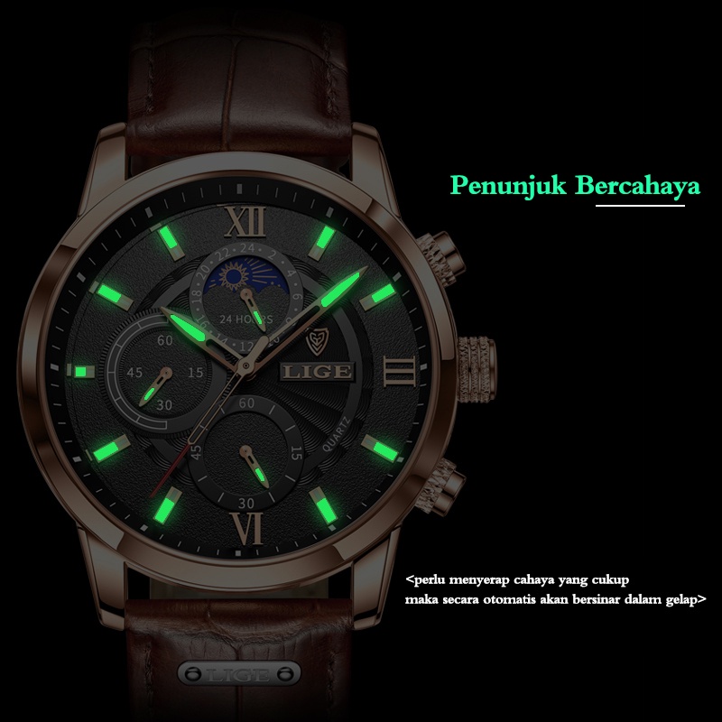 LIGE 8932 Original Jam Tangan Pria Tali Kulit Kronograf Aktif Anti Air Sports Jam Tangan + Kotak