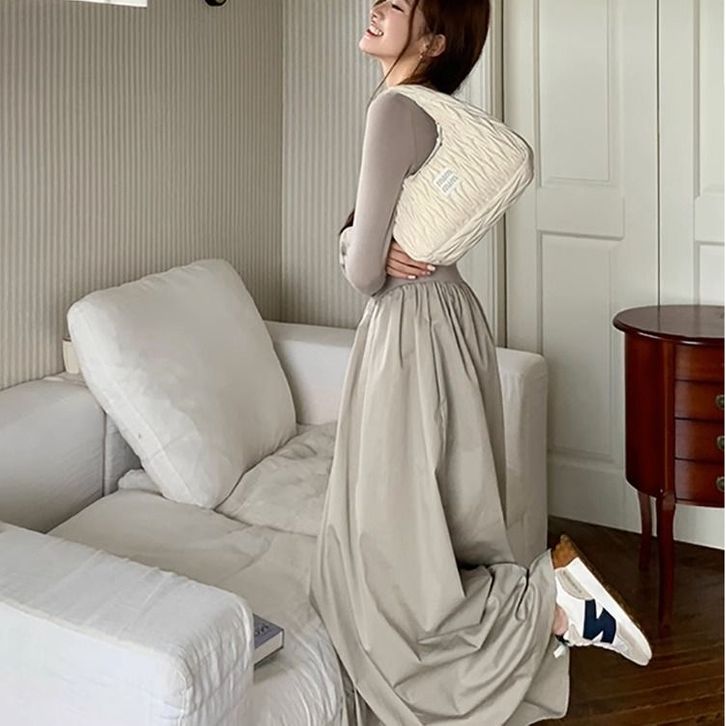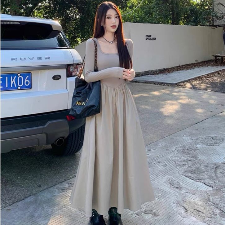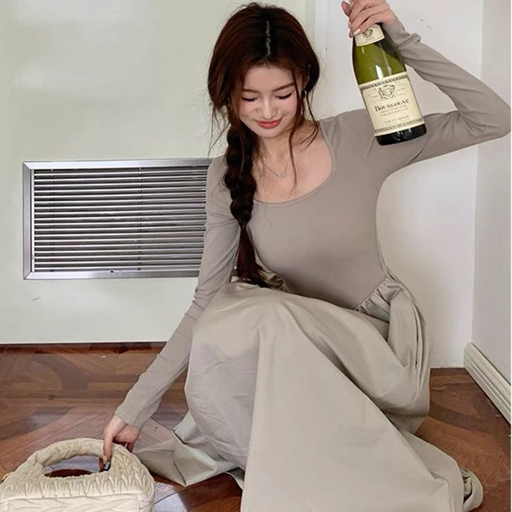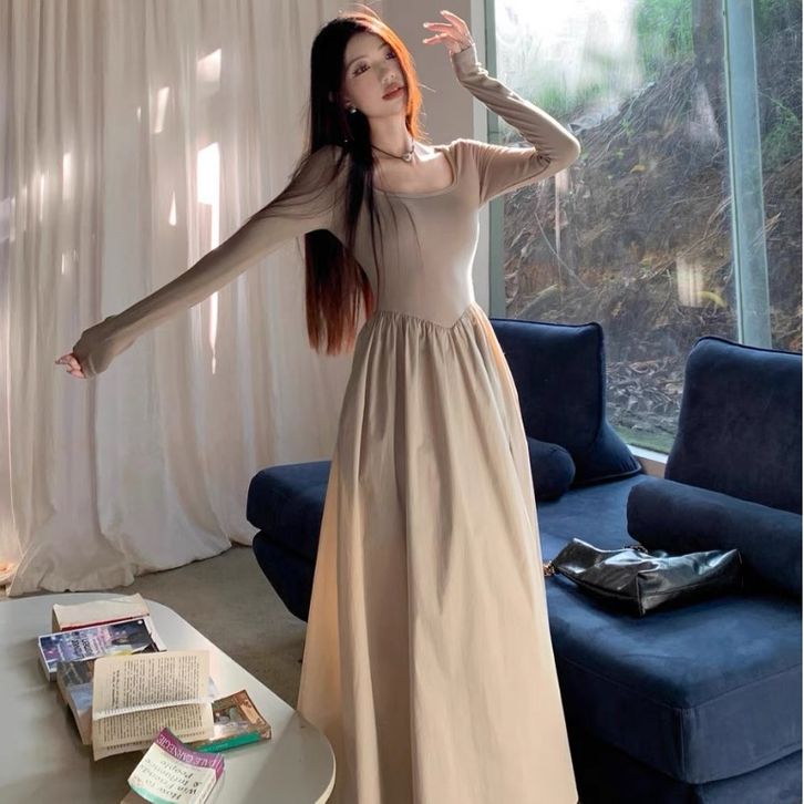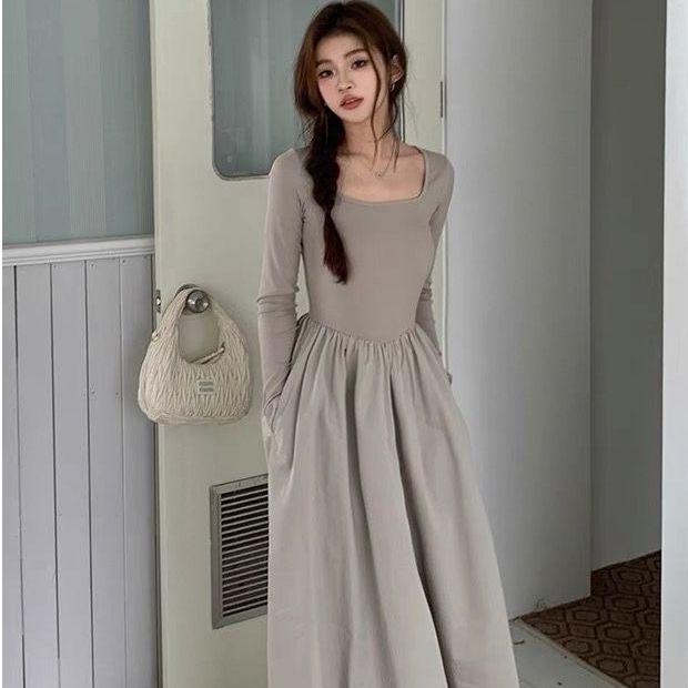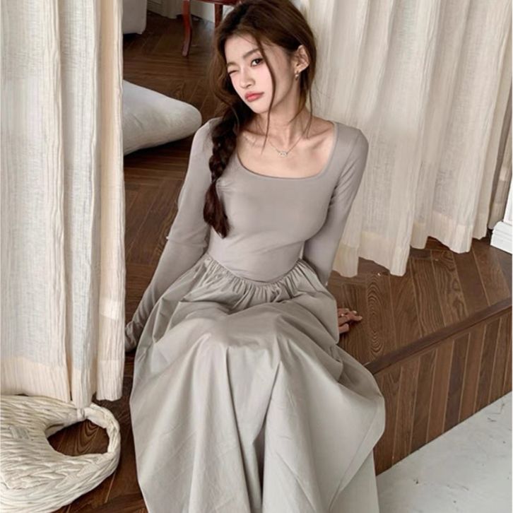 dress prancis dress abu abu dress panjang lengan temperamen sensorik tingkat tinggi baru rok panjang dalam rok panjang