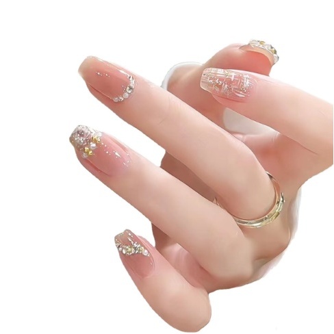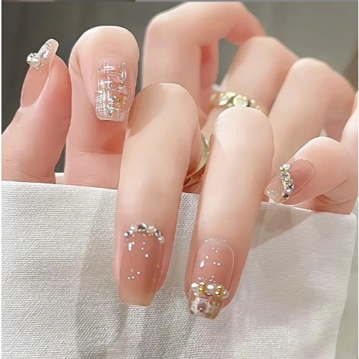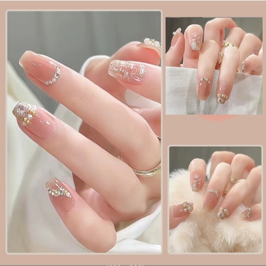 kuku palsu isi 24 pcs warna nude permata gold dan silver cantik lengkap dengan lem