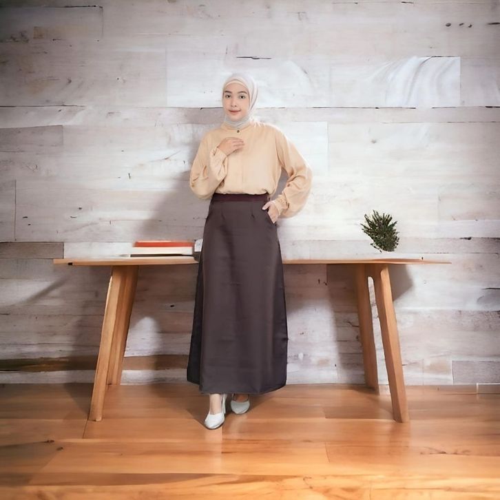 BARU DEJIFA - Rok Panjang Wanita Pinggang Karet A Line Ukuran Jumbo S-5L Coklat ebasg