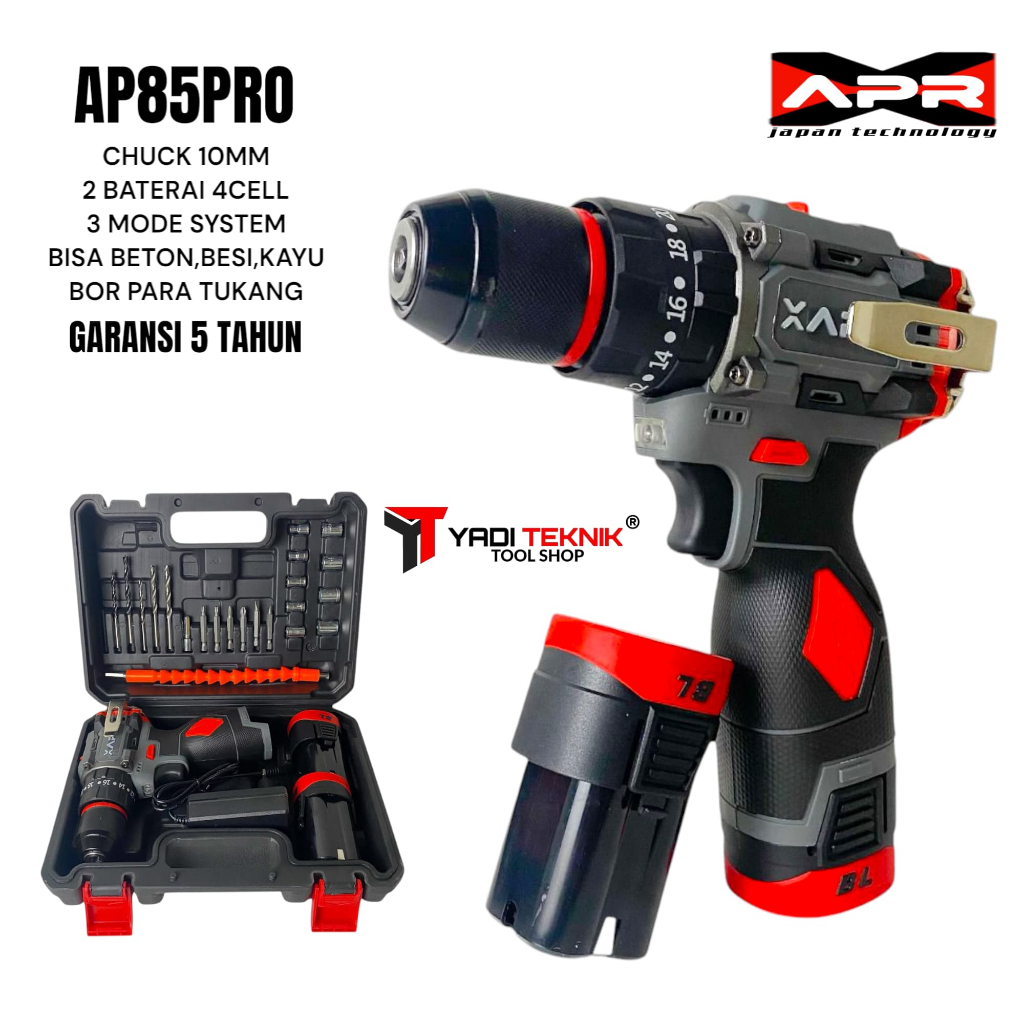 APR BOR impact drill BRUSHLESS TYPE AP85PRO 10mm keyless auto lock 2baterai mesin bor besi kayu driver sekrup drill