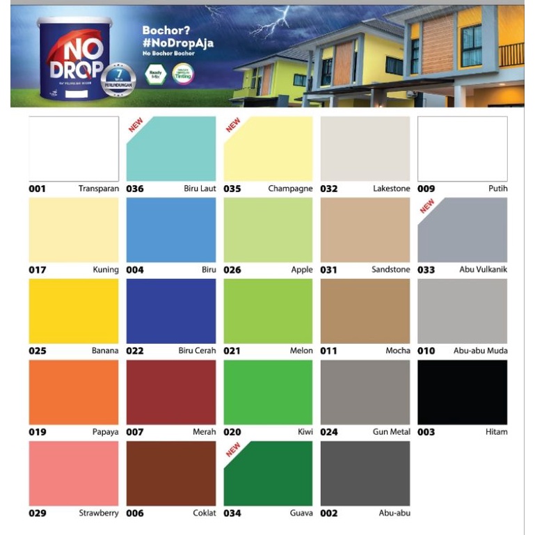 001, 002 Abu-abu, 003, 004, 007, 009 Putih, 010, 011, 017, 019, 020, 021, 022, 024, 025, 026, 029, 031, 032, 006, 033, 035, 036, Brilliant White, MWhite, 065, 061, 057, 063, 058