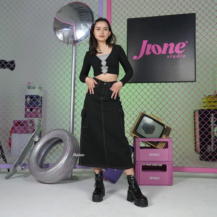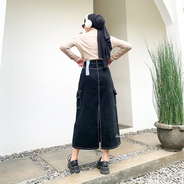 ROK CARGO JEANS WANITA / JINISO - HIGHWAIST ROK CARGO JEANS PANJANG 985 SEVENTY
