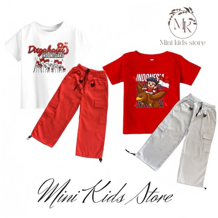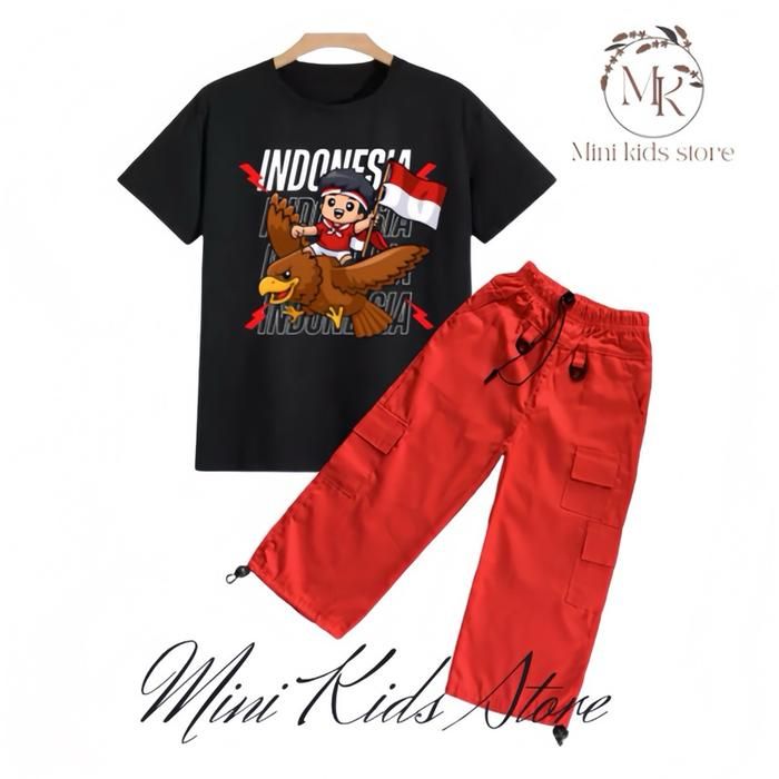 Setelan Kemerdekaan Anak Laki-Laki Rose Cargo Kaos Garuda Anak Dirgahayu Ke-delapan puluh Merah Putih Korean Style