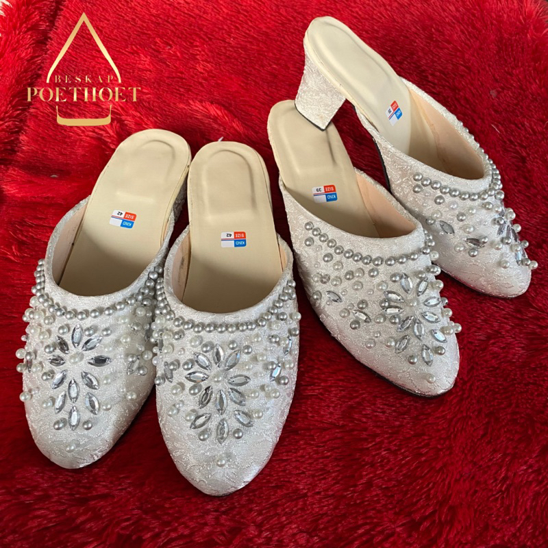 selop pengantin jawa payet broken white hak tahu 5cm sedang putih BW tulang gading wedding shoes pria wanita sepasang co