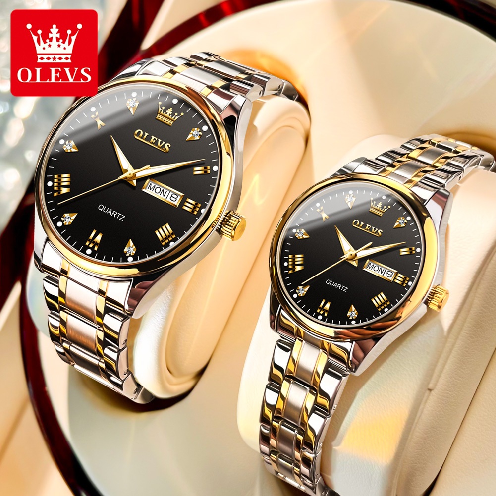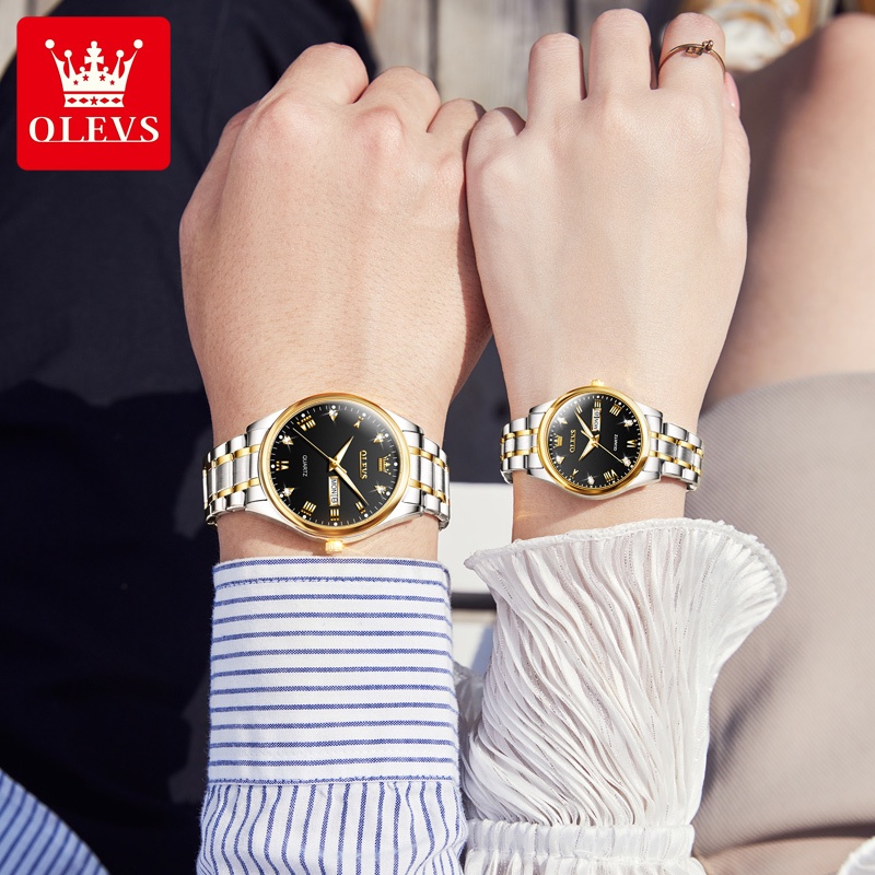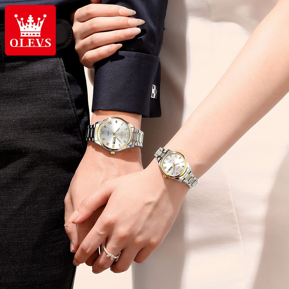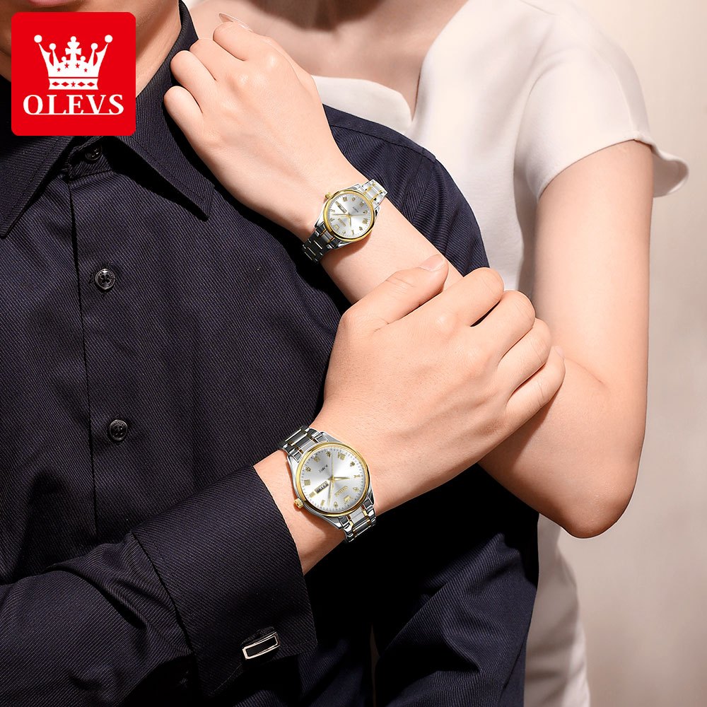 OLEVS Jam Tangan Couple Anti Air Original 100 PERSEN Resmi Stainless Steel Rantai Luminous Kalender Fashion Analog Cowok Cewek